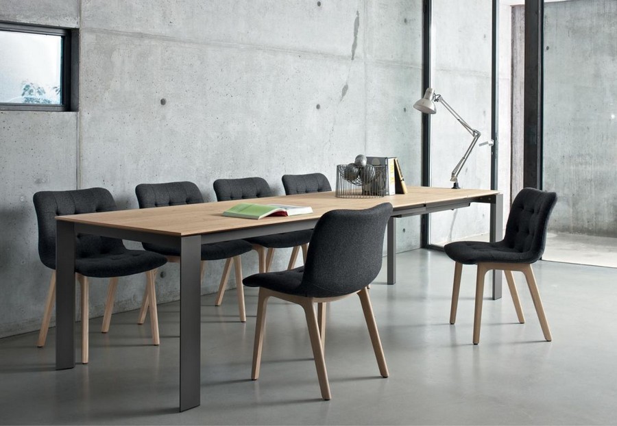 Der Tisch Pascal Bontempi lässt sich dank seiner drei Ausziehplatten auf eine Länge von 319 cm verlängern. Sein schlichtes, modernes und elegantes Design verleiht Küchen und Wohnzimmern einen einzigartigen und unverwechselbaren Stil. Der Ausziehmechanismus ist passend zum Stahlgestell lackiert.