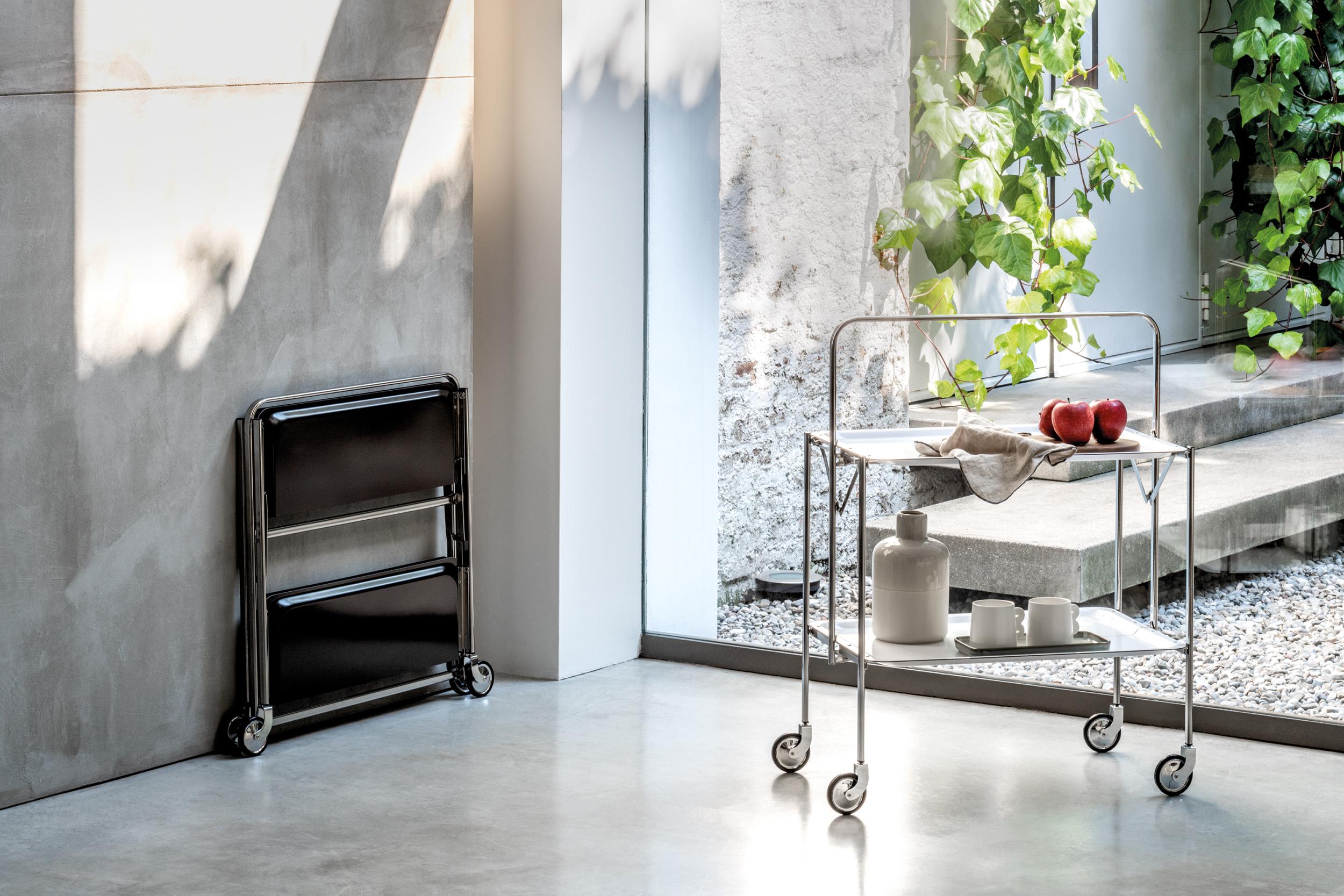 Klappbarer Servierwagen. Stahlrahmen und weiße oder schwarze Formica-Ablagen.