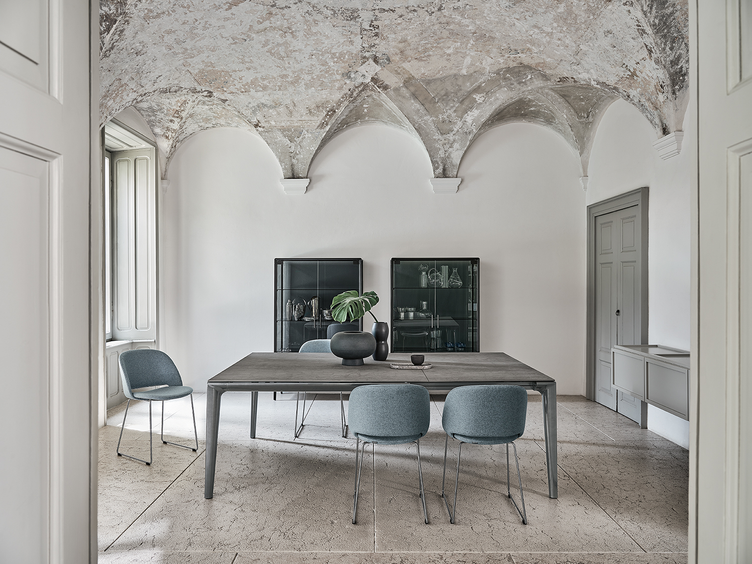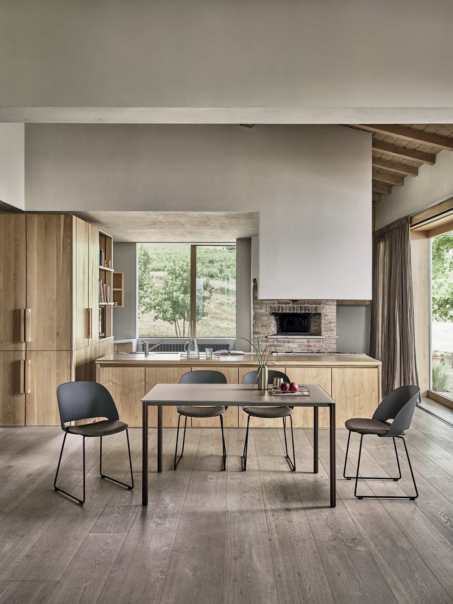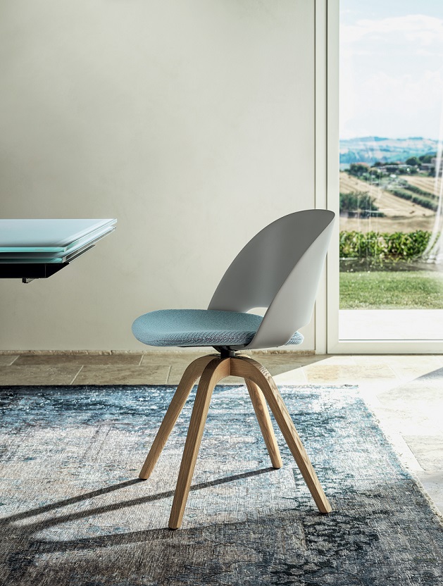 Stuhl mit Massivholz- oder Rundstahlgestell, Gitter- oder Stahlstabgestell. Rückenlehne aus Polypropylen und Sitz aus Holz oder gepolstert und bezogen in zahlreichen Ausführungen.