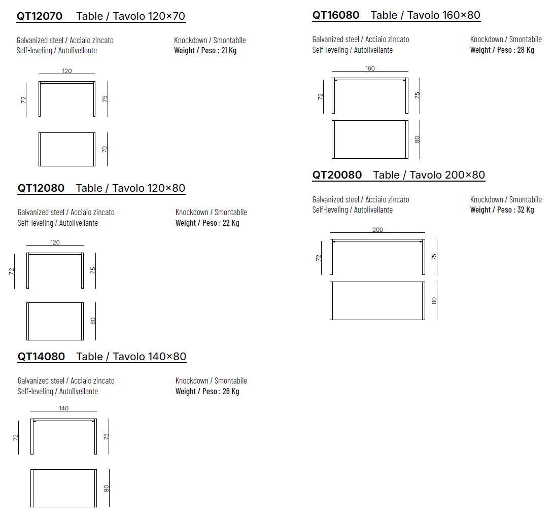 QT12080 | cm: L. 120 x T. 80 x H. 75 Abnehmbare selbstnivellierende |