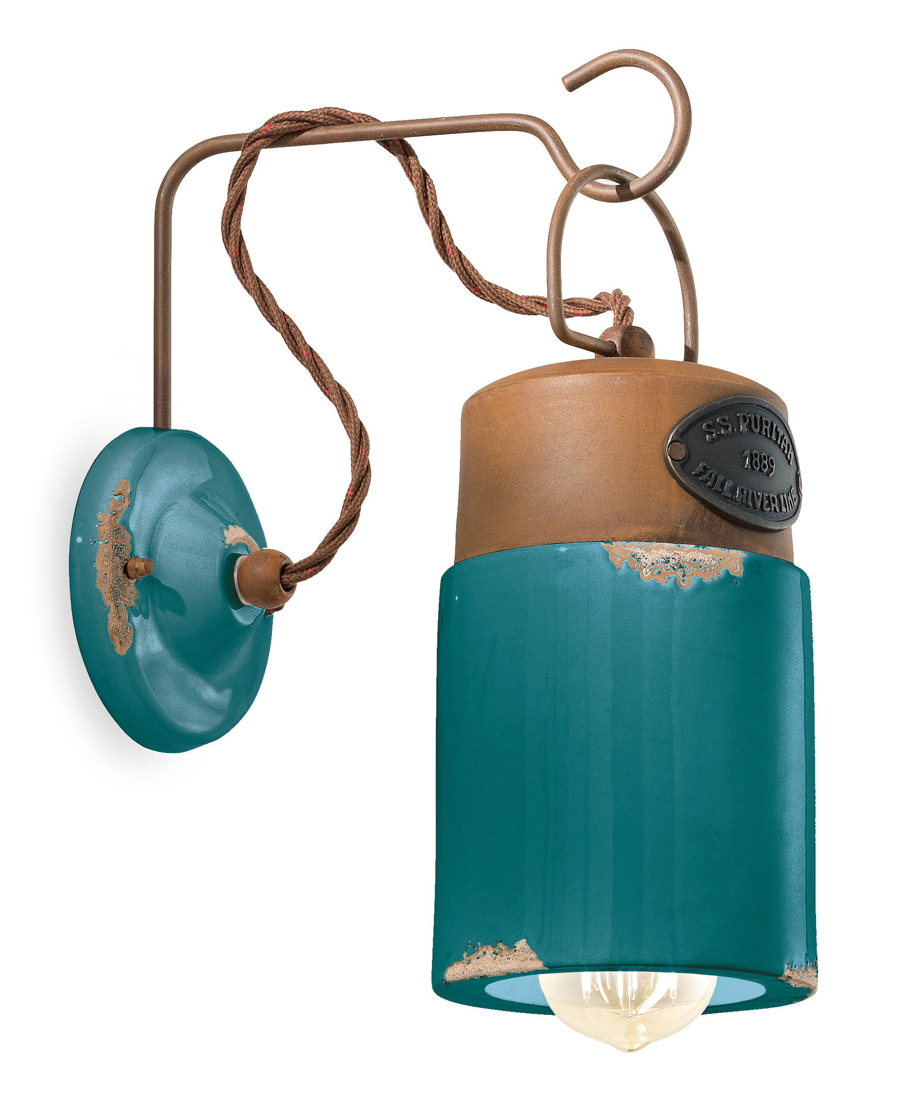Keramiklampe mit antikem Corteneisenrahmen und ummanteltem Baumwollkabel.