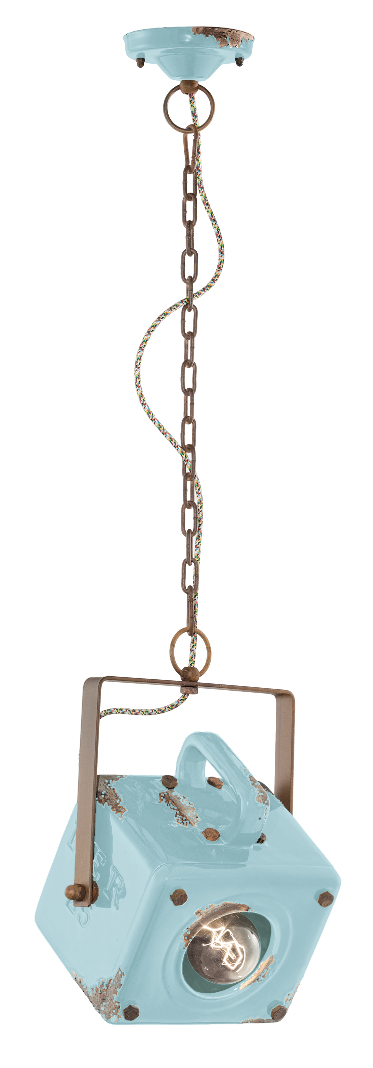 RETRO' INDUSTRIAL C1652 Hängeleuchte von Ferroluce. Keramiklampe mit Metallteilen und antiker Kette aus Corteneisen und mehrfarbig ummanteltem Baumwollkabel.
