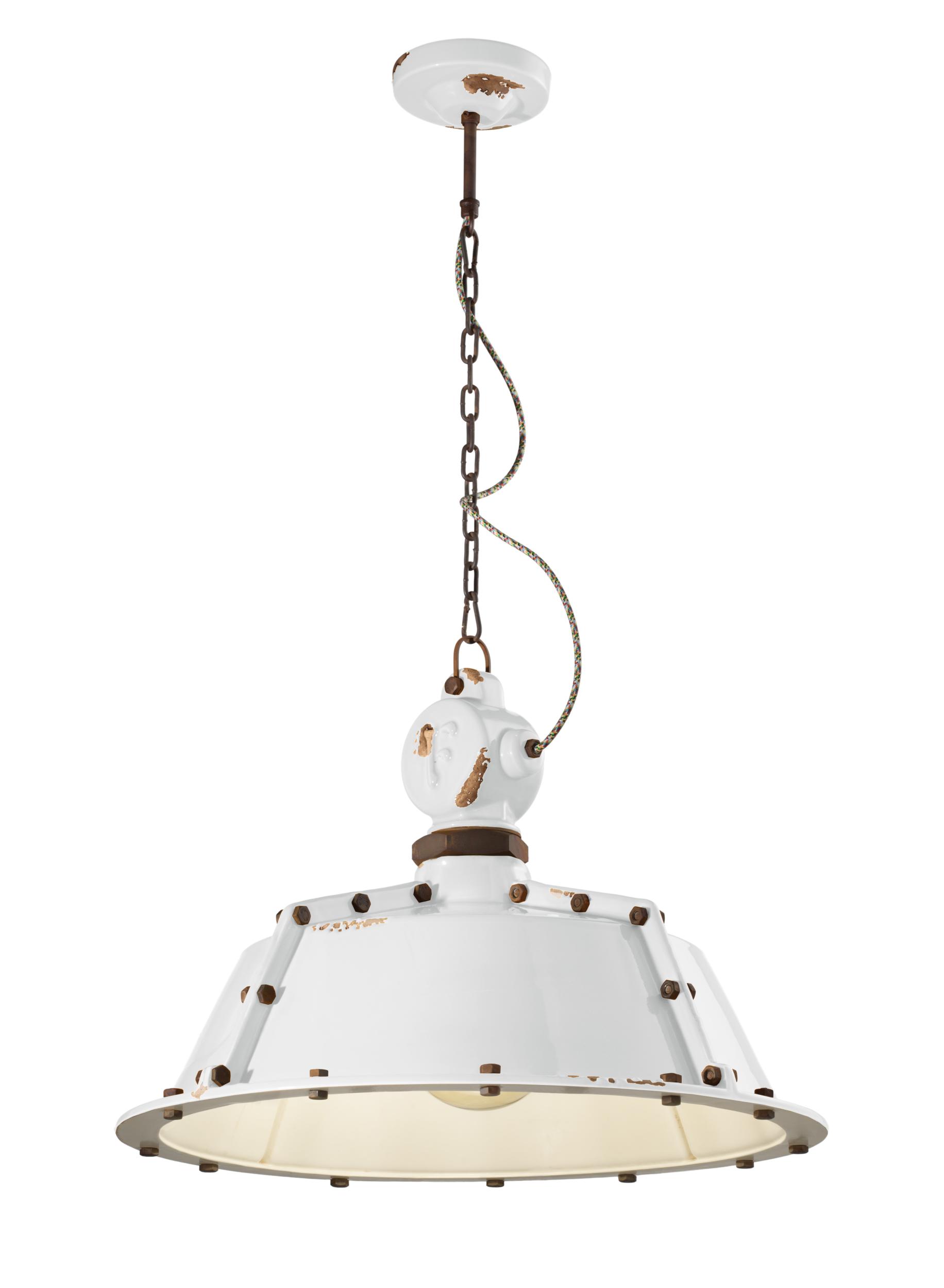 RETRO' INDUSTRIAL C1720 Hängeleuchte von Ferroluce. Keramiklampe mit Metallteilen und antiker Corteneisenkette und mehrfarbigem, ummanteltem Baumwollkabel.
