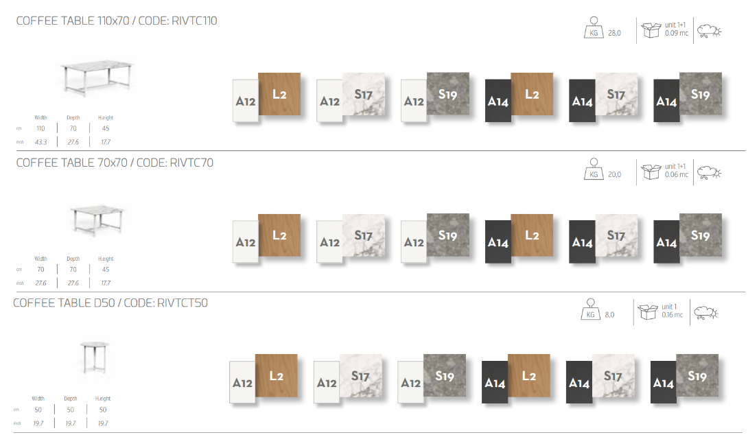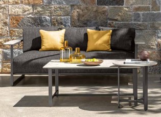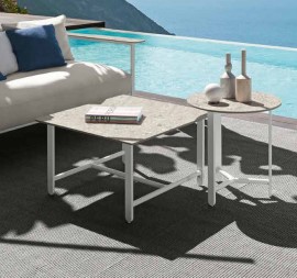 Der Couchtisch aus der Riviera-Kollektion von Talenti, der über ein lackiertes Aluminiumgestell und eine Tischplatte aus Feinsteinzeug verfügt und für den Außenbereich geeignet ist, ist in drei Größen erhältlich.