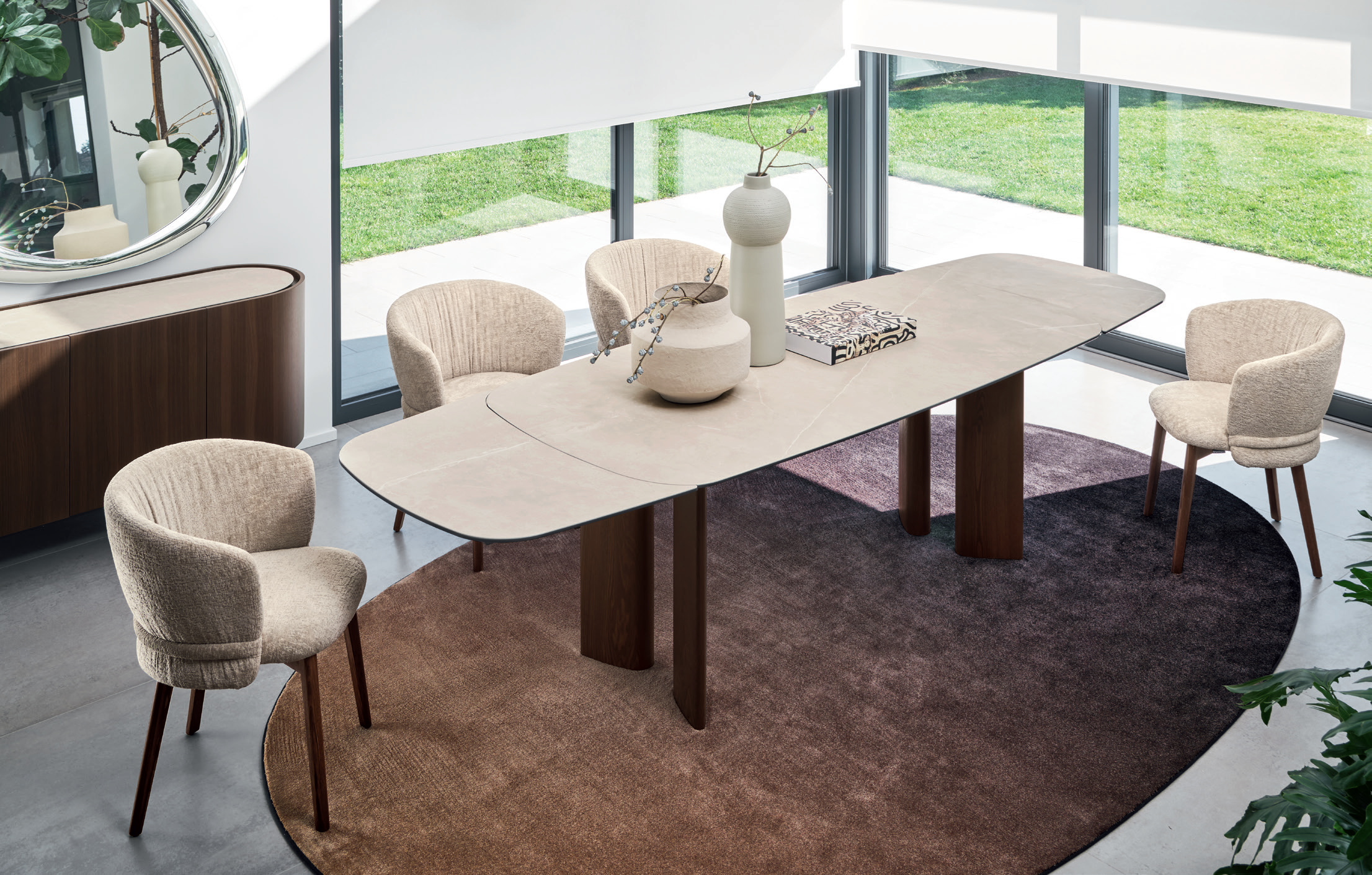 Ausziehbarer Tisch Sandy mit tropfenförmigem Bein, einem Abschnitt mit raffiniertem Design, der verschiedene Tischplattengeometrien aufnehmen kann.