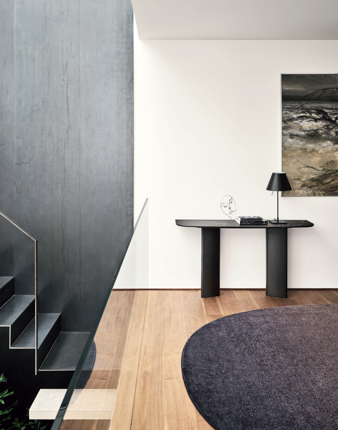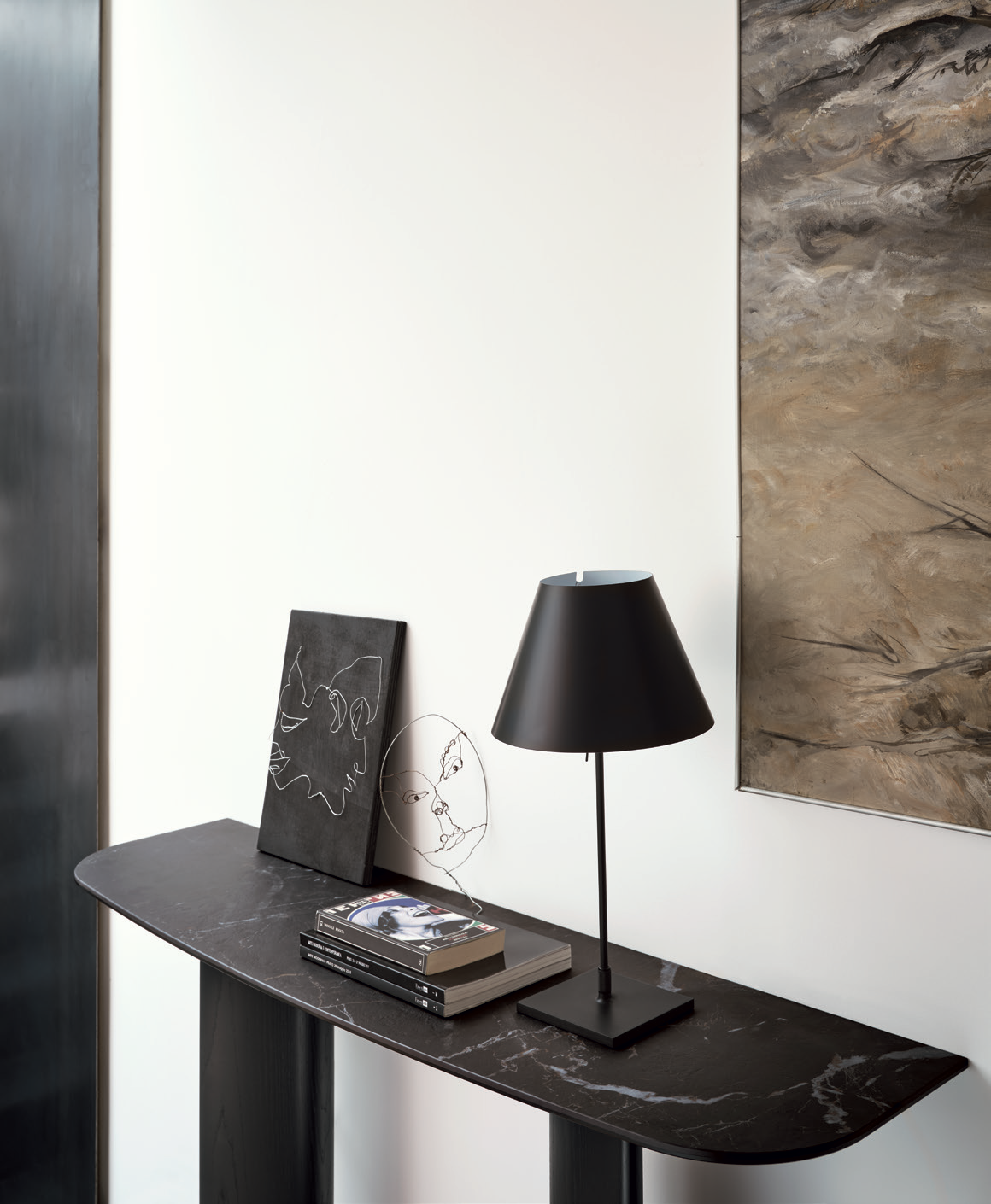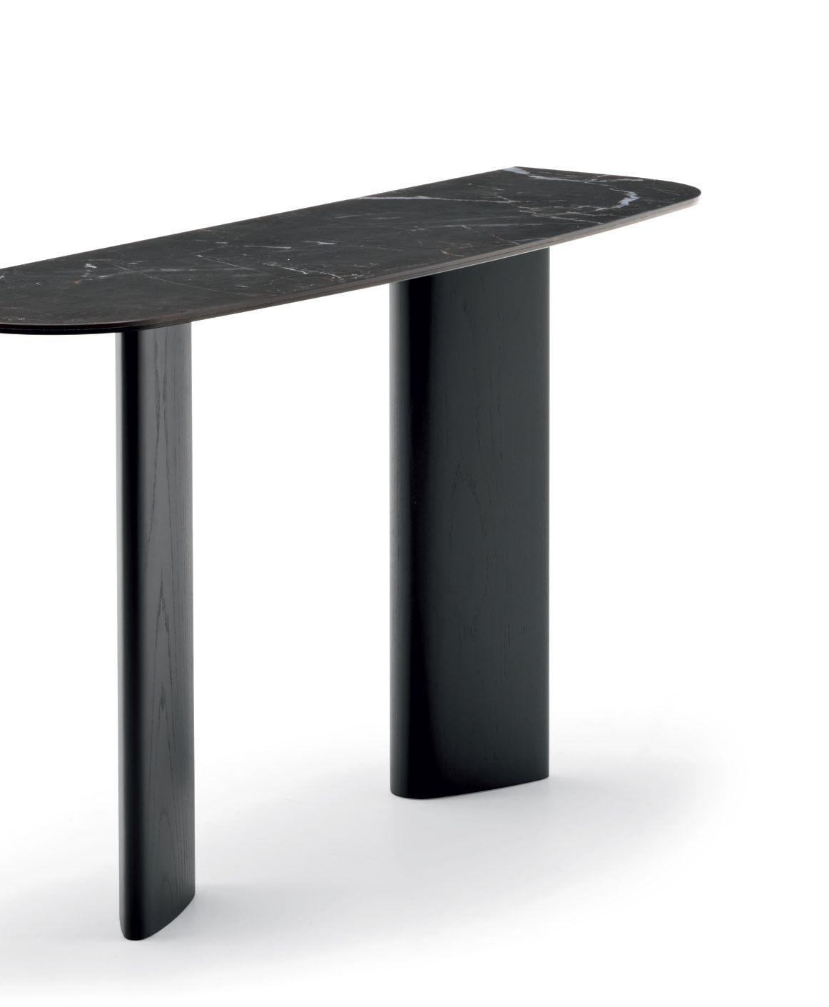 Zum umfangreichen Sandy-Programm gehört auch der Konsolentisch, der stets durch das tropfenförmige Bein gekennzeichnet ist, das durch seinen schrägen Abschnitt eine starke Dreidimensionalität erhält.