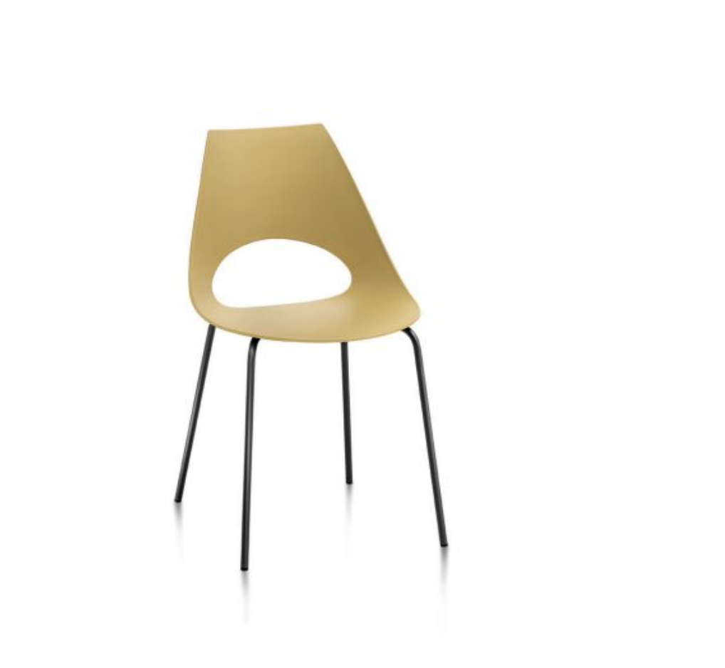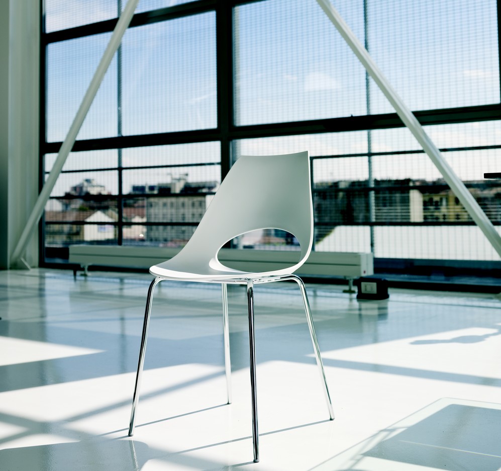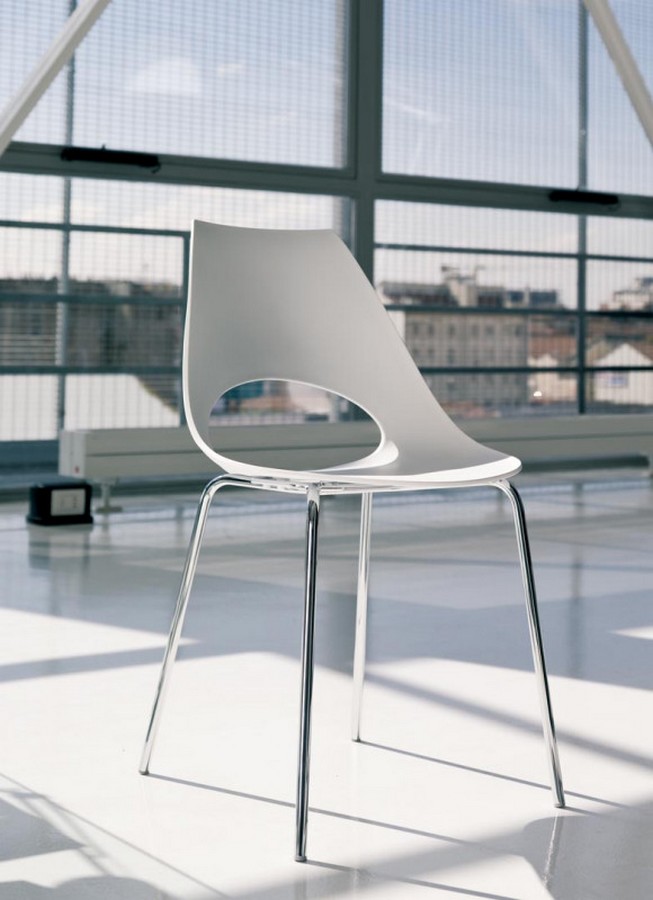 Shark-Stuhl von Bontempi mit lackierter oder verchromter Stahlstruktur, der umhüllende und ergonomische Sitz ist aus Polypropylen. Die Form der Rückenlehne ist sehr praktisch und leicht zu handhaben.
