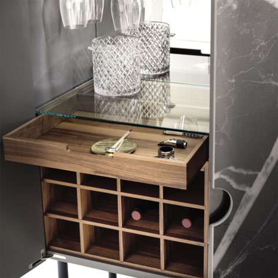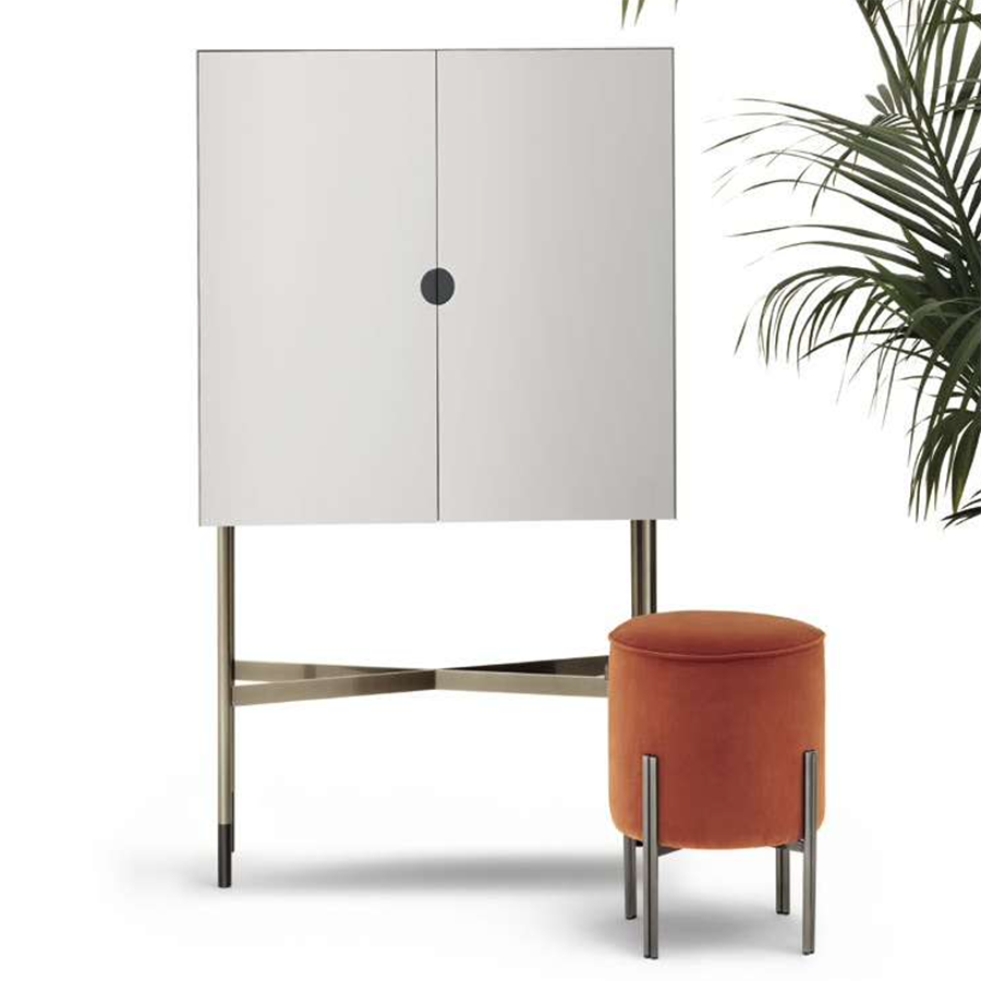 Sideboard aus Holz, bestehend aus zwei Flügeltüren, innerem Regal aus transparentem Kristall, innerer verspiegelter Rückwand. Oberseite, Seiten und Türen aus lackiertem Holz, Kristall oder Supermarmor, dekorative Füße und Griffe Ihrer Wahl.