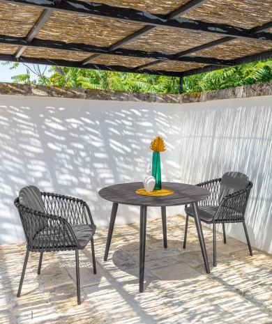 Der komplett aus Aluminium gefertigte Esstisch Sofy ist stabil und elegant. Dank seiner großen, runden Tischplatte und seiner Witterungsbeständigkeit eignet er sich perfekt für den Außenbereich.