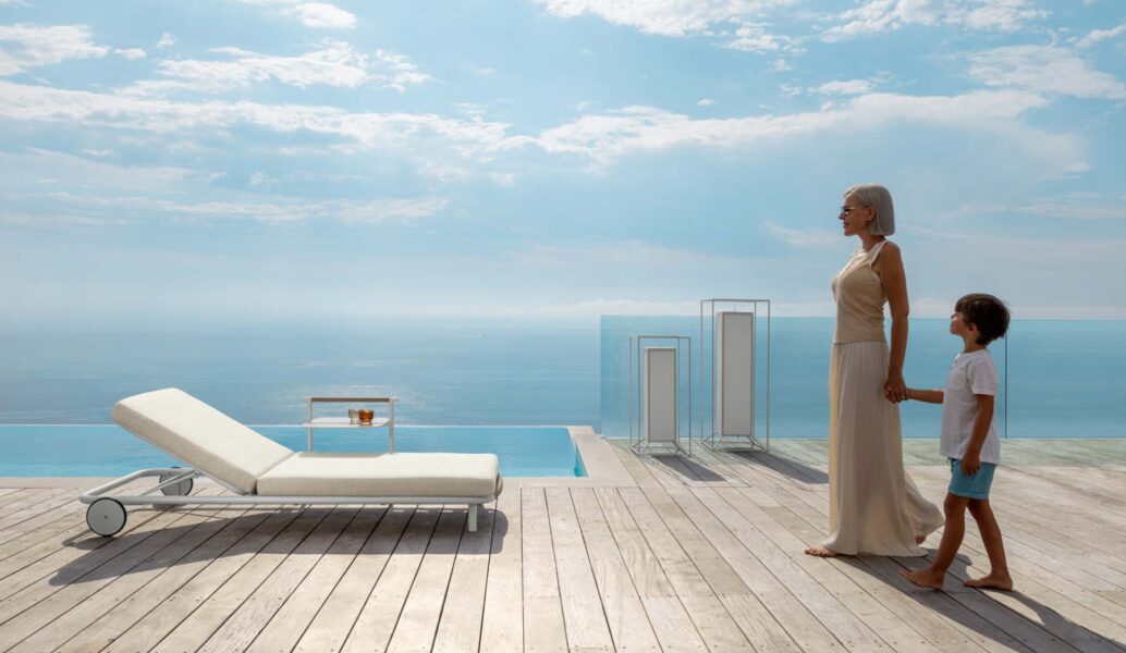 Die Sonnenliege Coral besticht durch einen spielerischen Kontrast der Proportionen: Die luftig-leichten Linien des Aluminiumrahmens bilden einen reizvollen Kontrast zu den soliden, großzügigen Kissen. Der vordere Griff, umwickelt mit farblich passenden Kunstfasern, ist ein markantes Merkmal. Dank der zwei verfügbaren Farben wird die Liege zu einem unverwechselbaren Element für einen eleganten und stilvollen Außenbereich.