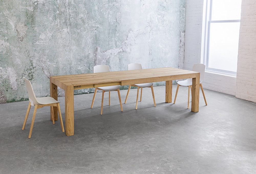 Der Tola ausziehbare Tisch von Point hat eine natürliche Holzstruktur. Der Öffnungsmechanismus ist auf einem Metallrahmen mit Aluminiumführungen und Kugellagern montiert. Die Beine sind aus natürlichem Eichenfurnier oder Roheisen. Der Tola-Tisch ist mit dem Pointhouse-Design und der Pointhouse-Technik die Rückkehr zum natürlichen Material; die Suche nach einem Finish, das sich angenehm anfühlt und im Flammenspiel des Holzes sichtbar zart und raffiniert ist.