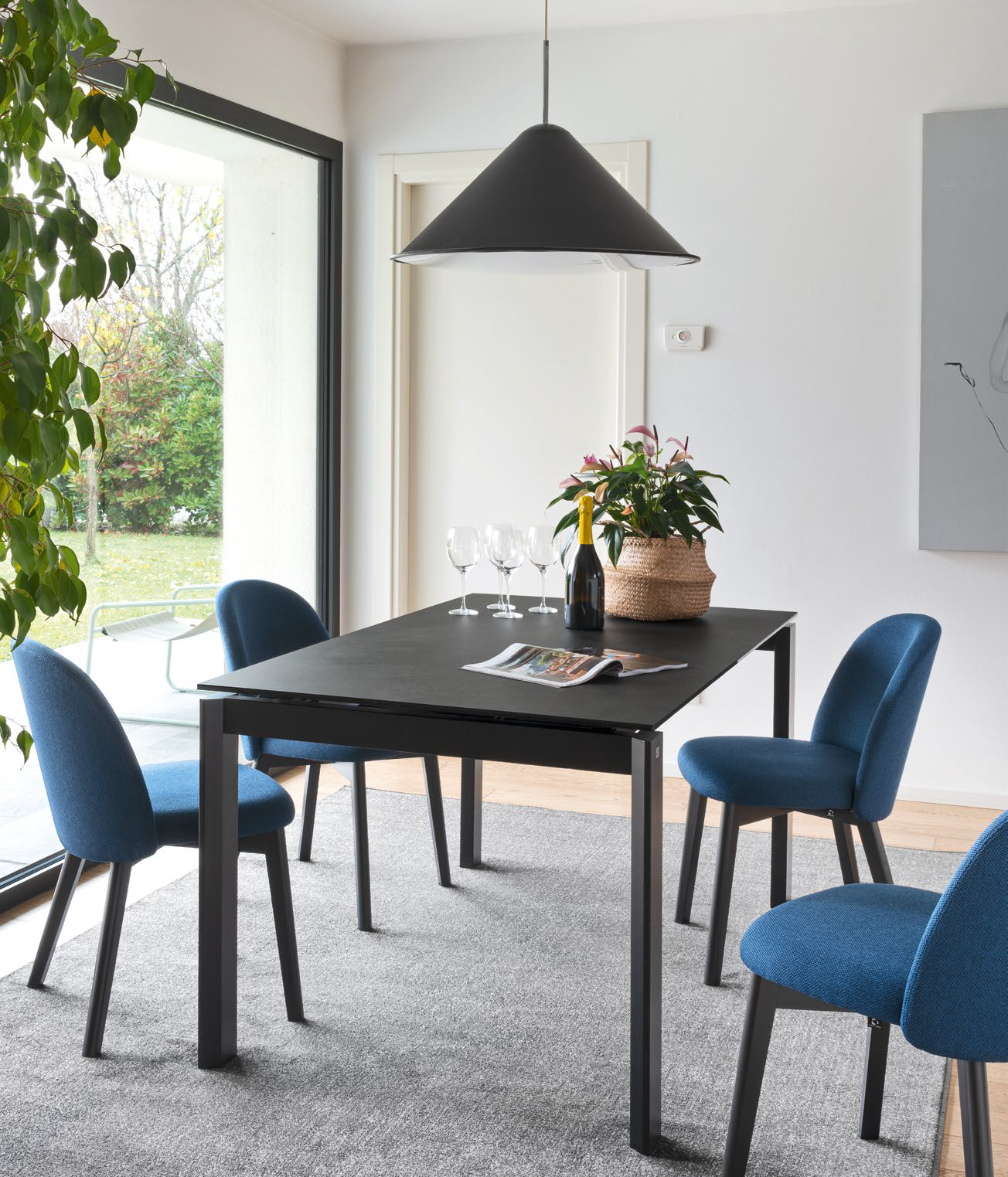 Tuka CB1994 Stuhl von Connubia mit vier Beinen aus Buchenholz. Feste, gepolsterte und bezogene Schale mit umhüllender Rückenlehne und abgerundeter Sitzfläche.