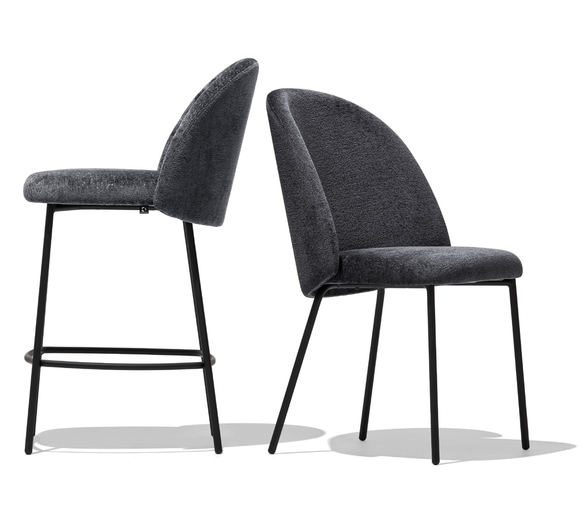 Tuka Mid Hocker mit 4 Metallrohrbeinen. Feste, gepolsterte und bezogene Schale mit mittelhoher, umhüllender Rückenlehne und abgerundeter Sitzfläche.