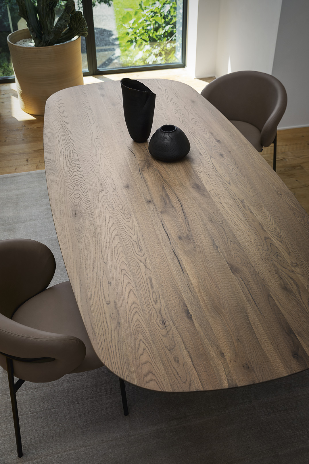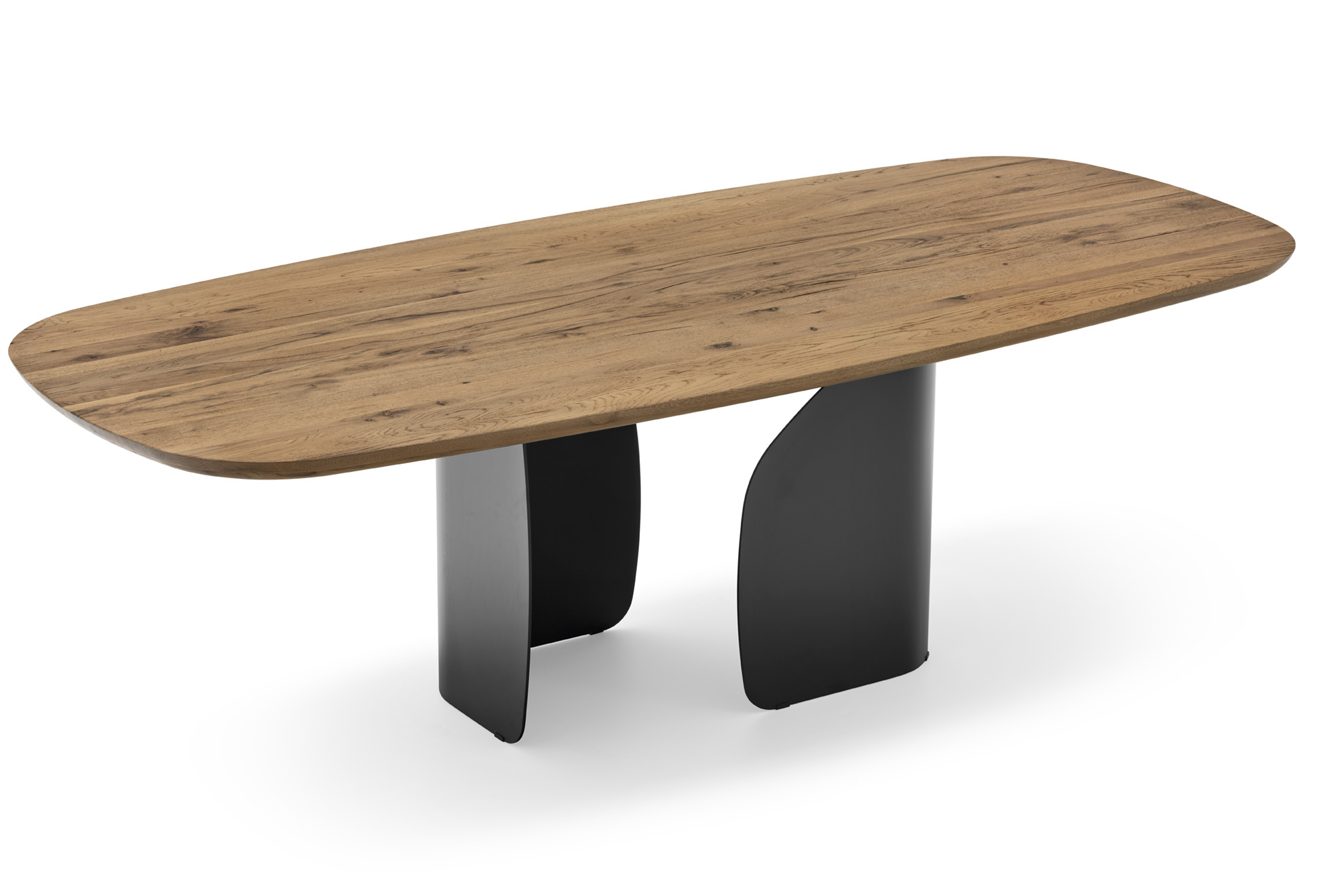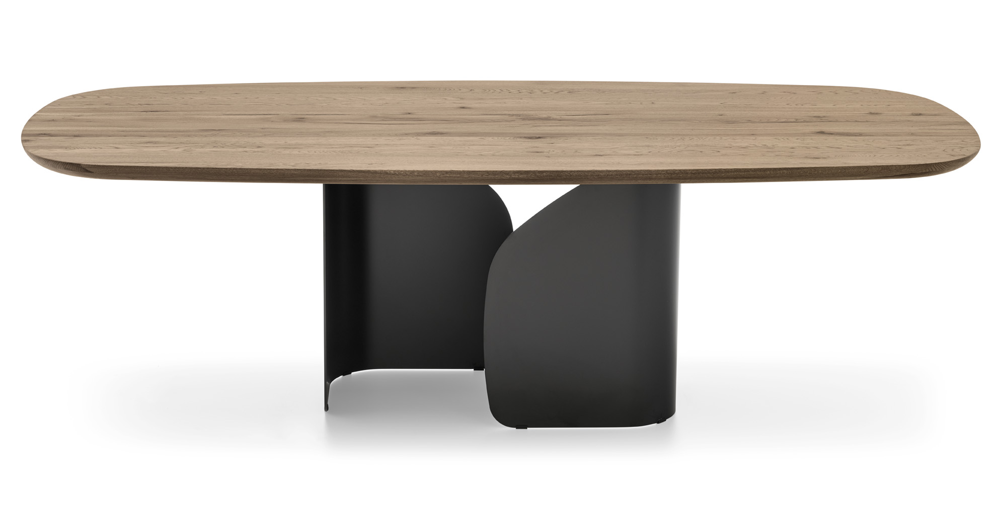 Der elliptische Tisch Twins von Calligaris ist ein optisch beeindruckender Tisch. Dies verdankt er seinem Untergestell aus zwei gebogenen und geformten Blechelementen, die die Tischplatte optisch wie Flügel anheben. Zahlreiche Ausführungen ermöglichen eine klassische oder moderne Interpretation des Tisches.