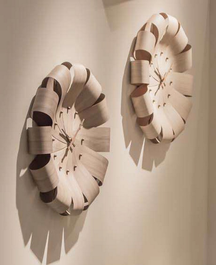Ciclo Uhr von Nomon mit Holz in Walnuss oder Eiche furniert. Die subtilen Falten erzeugen dreidimensionale Formen, die an die Natur erinnern. Hände aus Naturnuss oder Eiche.