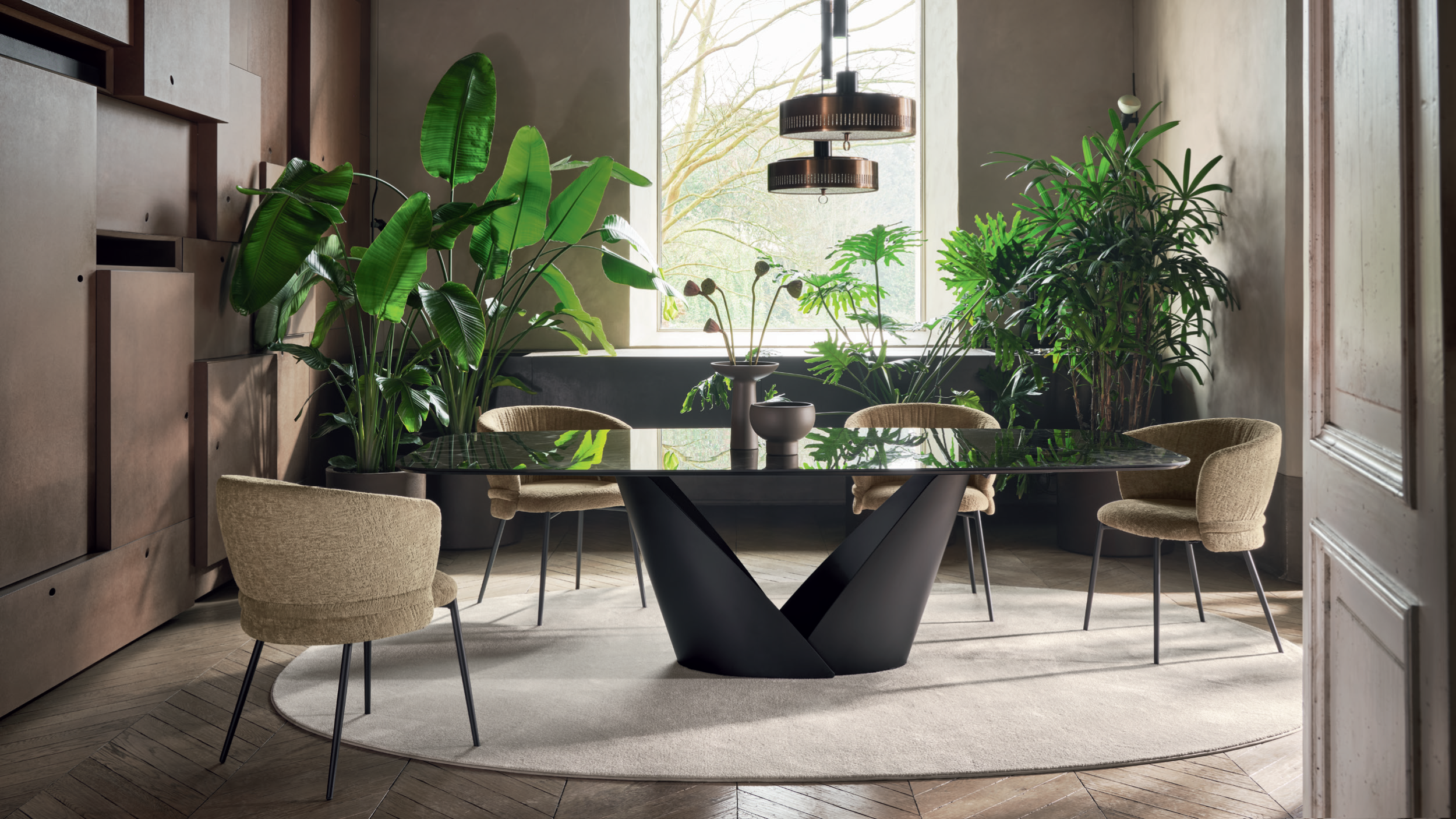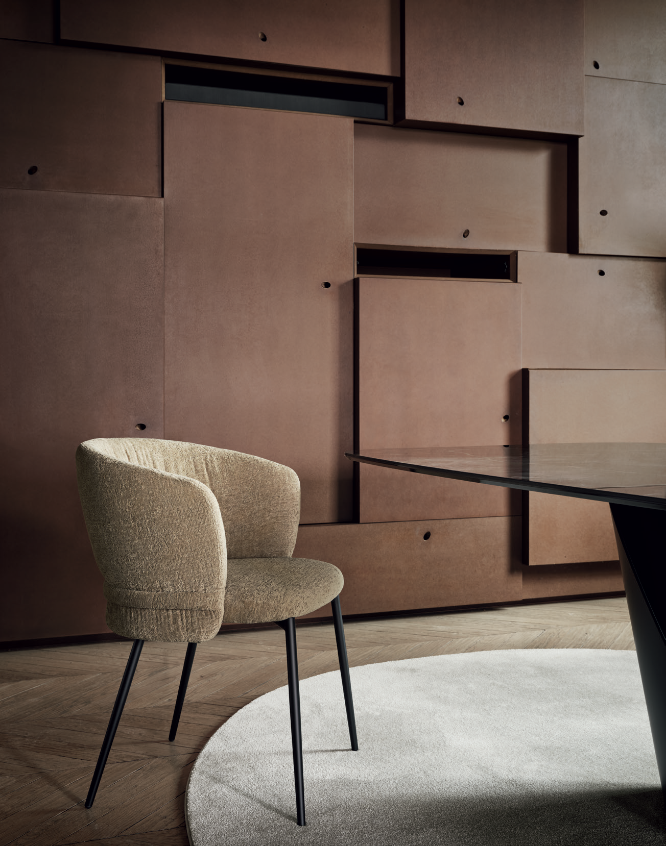 Vanilla ist ein Stuhl, dessen Proportionen und Komfort an einen kleinen Sessel erinnern. Inspiriert von der Modewelt zeichnet er sich durch markante Raffungen im Stoff und ein horizontales Element aus, das die Rückenlehne wie ein Gürtel umschließt. Die Holz- und Metallbeine unterstreichen seine natürliche Eleganz.