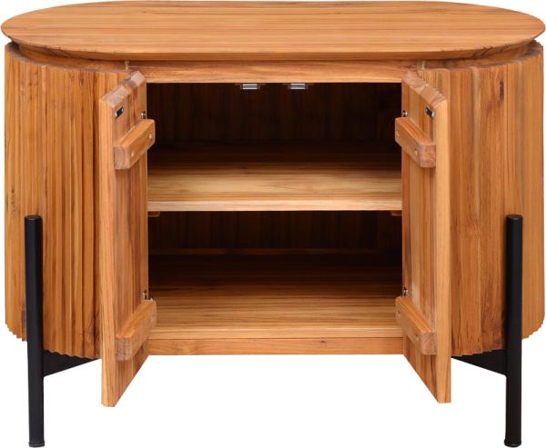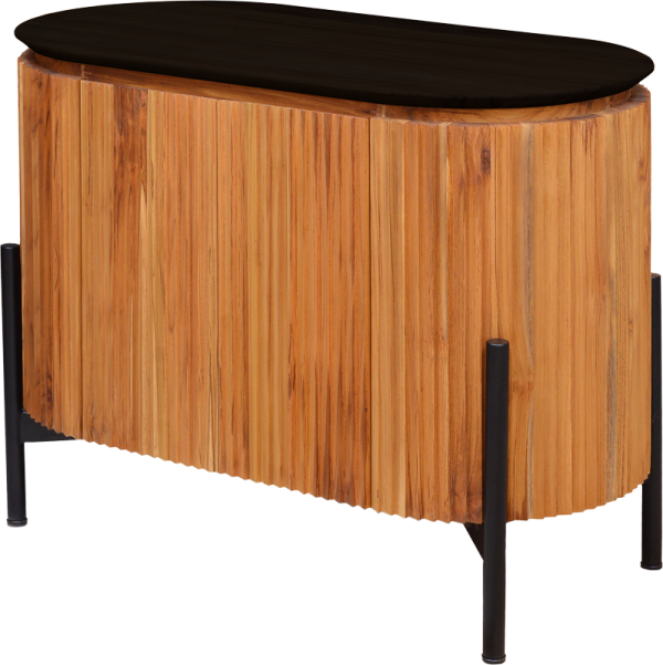Zwei praktische Türen ermöglichen den Zugang zu großzügigen Stauräumen, die Füße aus schwarzem Teakholz straffen die Möbel und unterstreichen die vollständig handgefertigte „Zahnrad“-Verarbeitung, und die 45°-Platte schließt die Geometrien stilvoll ab. Natürliches Teakholz der Klasse A, raffinierte Formen und Volumen, ohne Griffe oder sichtbare Metalldetails für ein Möbelstück, das vom „Bolidismus“ geprägt ist. Nur extra trockenes, massives Teakholz, um maximale Leistung zu gewährleisten. Die Oberseite ist mit natürlichen Wachsen behandelt, die Wasser widerstehen bzw. mit Wasser koexistieren sollen!