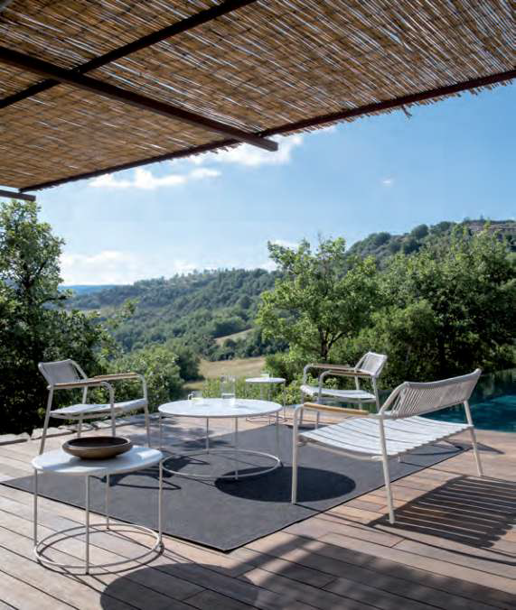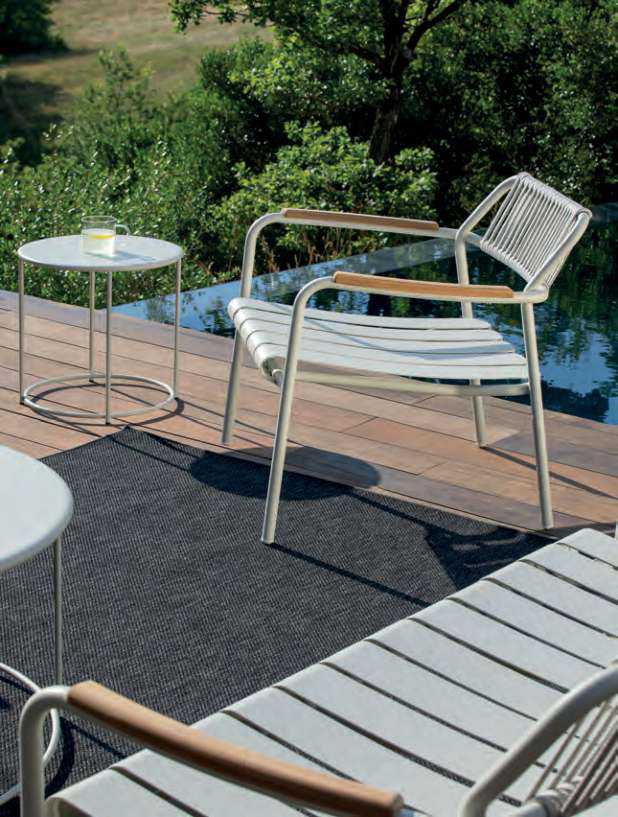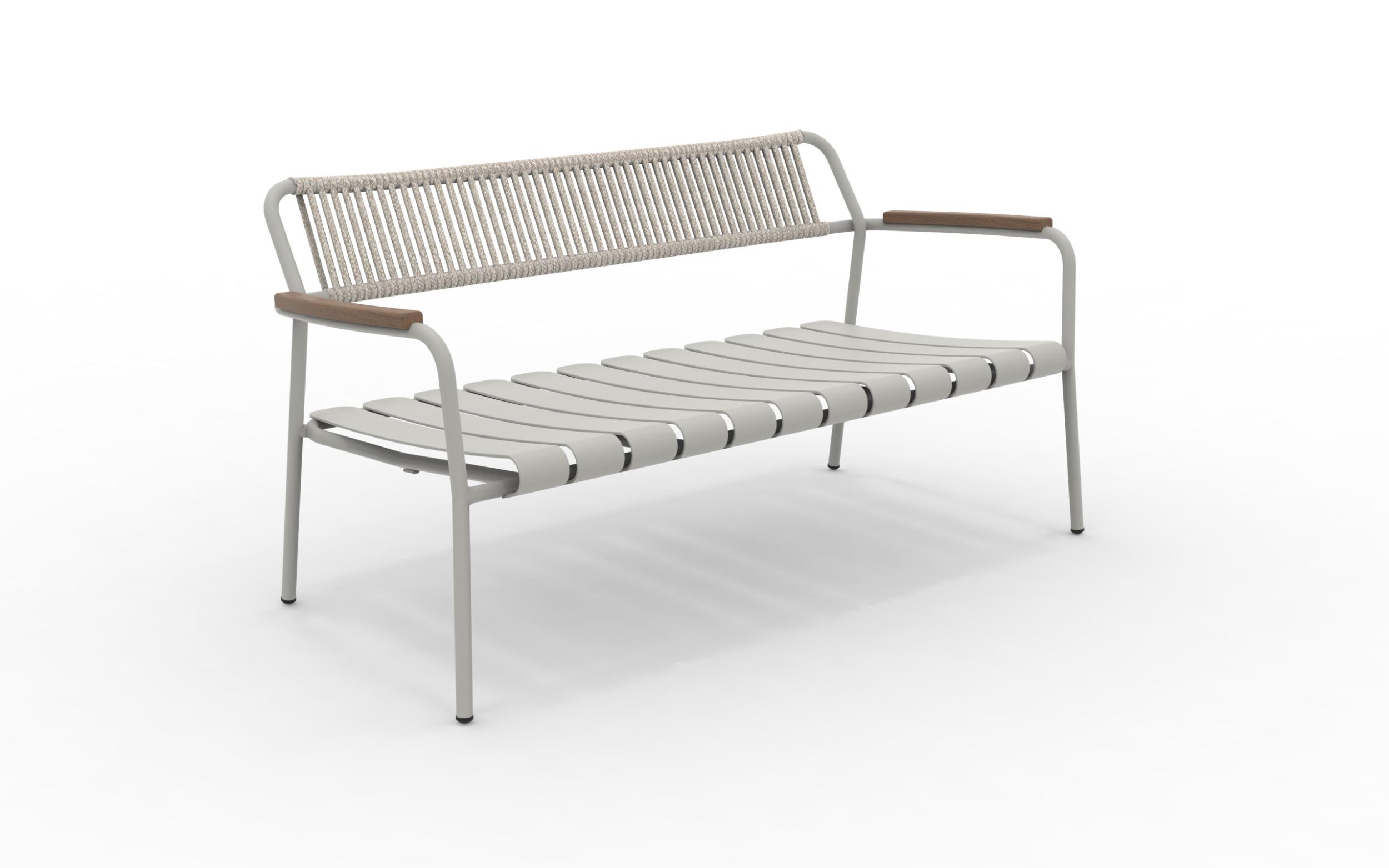 Das Sofa Verdea Rope aus Aluminium, Seil und mit FSC-Teakholz an den Armlehnen ist ein Einrichtungsaccessoire, das sich für jeden Garten oder jedes Wohnzimmer im Freien eignet. Stapelbares Sofa