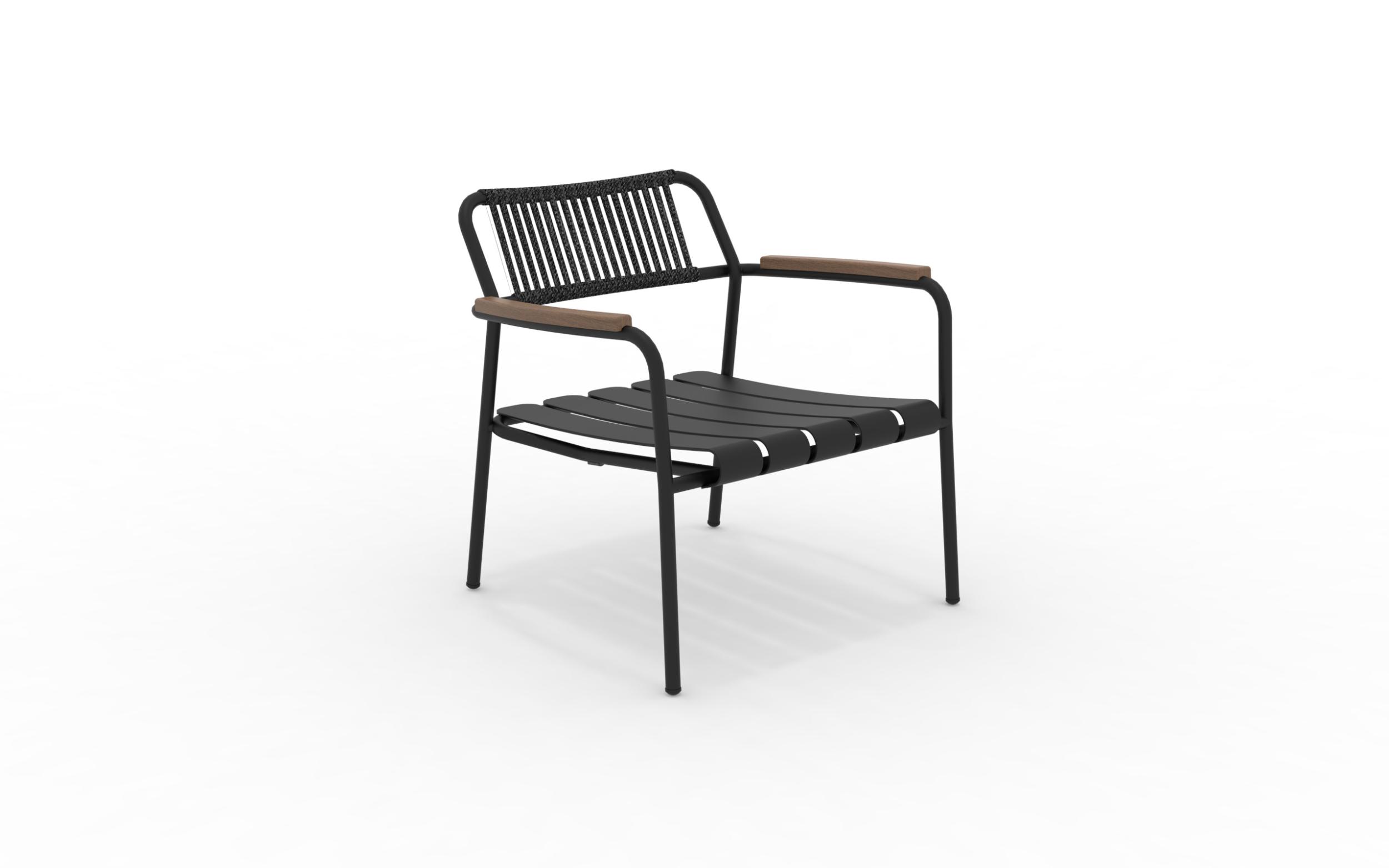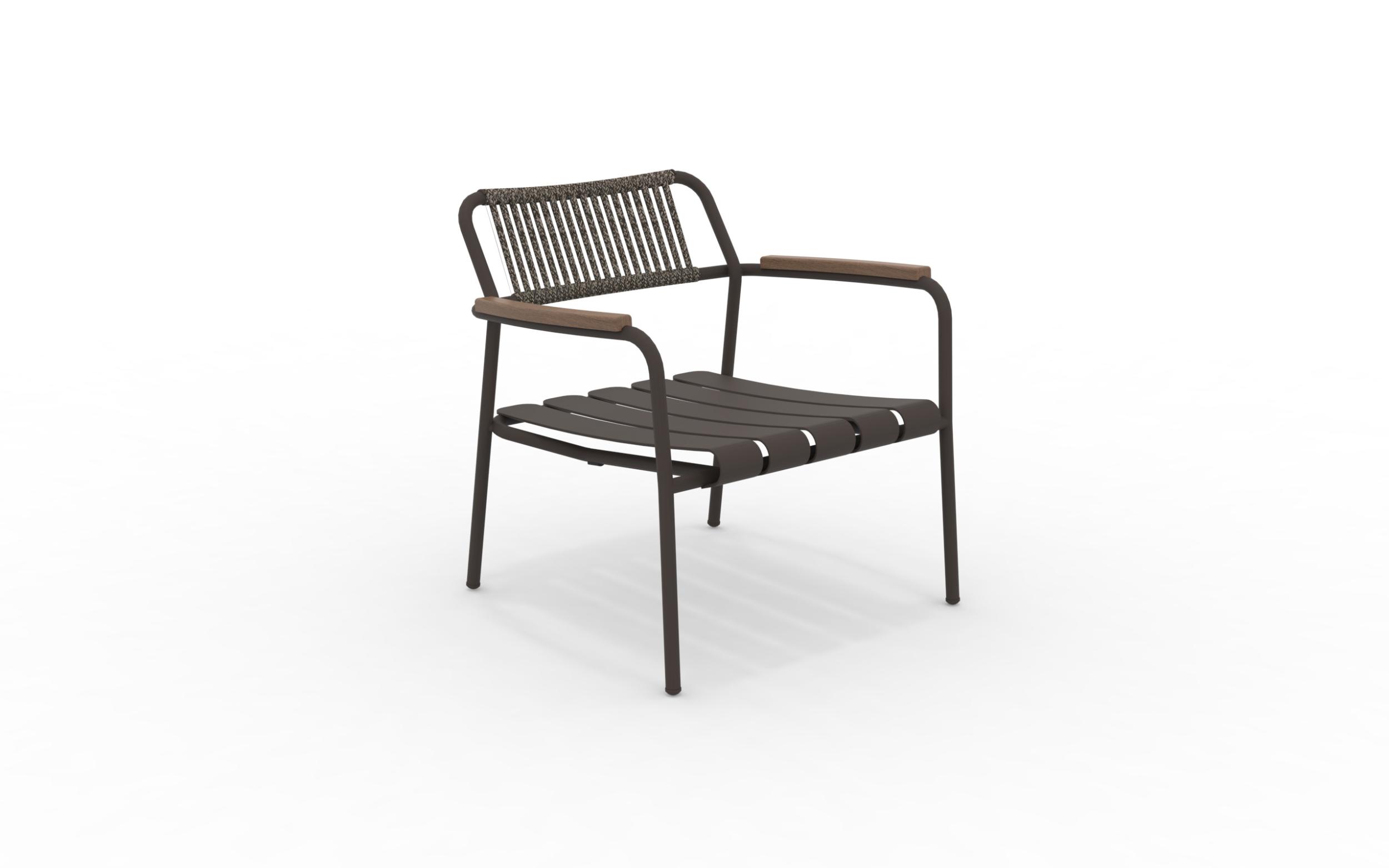 Der niedrige Sessel Verdea Rope von Vermobil aus Aluminium, Seil und mit FSC-Teakholzeinsätzen an den Armlehnen ist ein Einrichtungsaccessoire, das sich für jeden Garten oder jedes Wohnzimmer im Freien eignet. Dieser Sessel mit schlichten und modernen Linien vereint Stil und Vielseitigkeit, da er stapelbar und in zahlreichen Farben erhältlich ist. Stapelbarer Sessel.
