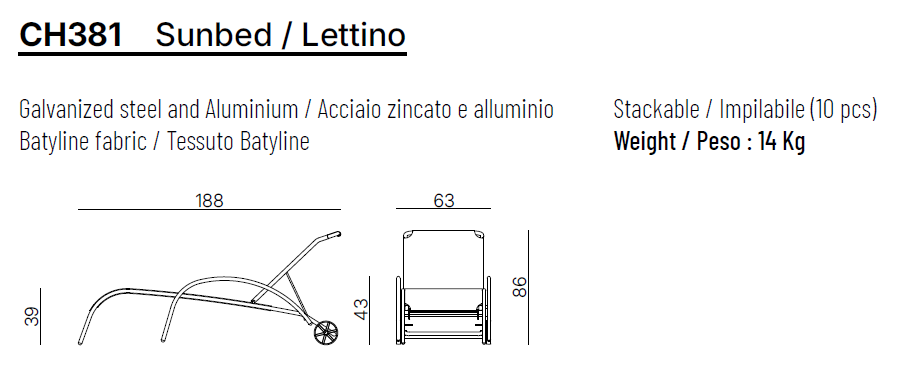 cm: L. 188 x T. 63 x H. 86 x HS. 39 x HB. 43