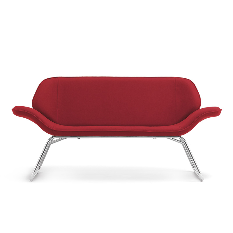 Das Zweisitzer-Sofa besticht durch sein klares, übersichtliches Design; die sehr leichte Tragstruktur, die seine formale Eleganz unterstreicht, ist in Chromausführung erhältlich.