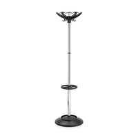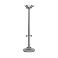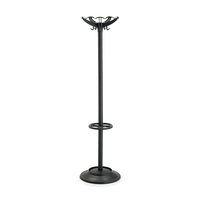 Garderobenständer mit Schirmständer mit runder Stahlkonstruktion mit schwarz lackierter Oberfläche und schwarzen Nylon-Kunststoffteilen oder verchromten und schwarzen Nylon-Kunststoffteilen oder grauen und grauen Nylon-Kunststoffteilen.