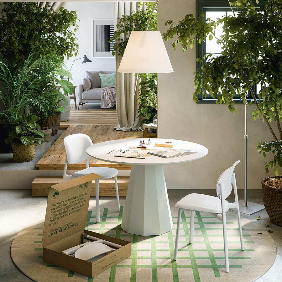 Zero besteht vollständig aus thermoplastischem Technopolymer mit 100 % recycelten Polyolefinen. Dieses Material ermöglicht die Herstellung von Produkten, die wesentlich umweltfreundlicher sind, da sie aus dem Recycling von Industrieabfällen gewonnen werden, die sonst entsorgt würden. Zero verzichtet nicht nur auf den Einsatz neuer fossiler Ressourcen, sondern recycelt auch Industrieabfälle und -reste, die als Rohstoffe in den Produktionskreislauf zurückkehren, ohne den ästhetischen und funktionalen Aspekt des Produkts zu beeinträchtigen.