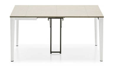 Consolle allungabile Artic di Connubia con struttura in metallo e piano in nobilitato è un tavolo a consolle allungabile con gambe sempre perimetrali, cinque allunghe stivabili a parte negli appositi contenitori, dotato di gamba supplementare centrale e reclinabile.