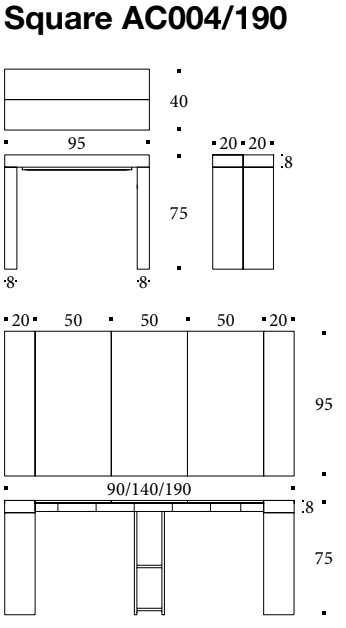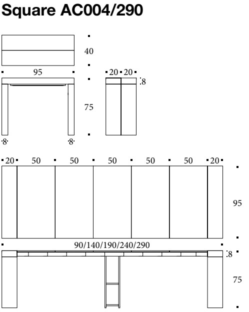 Consolle Square di Altacom estensibile in nobilitato, meccanismo telescopico in alluminio tre allunghe. Gambe centrali di supporto. Disponibile in due dimensioni.