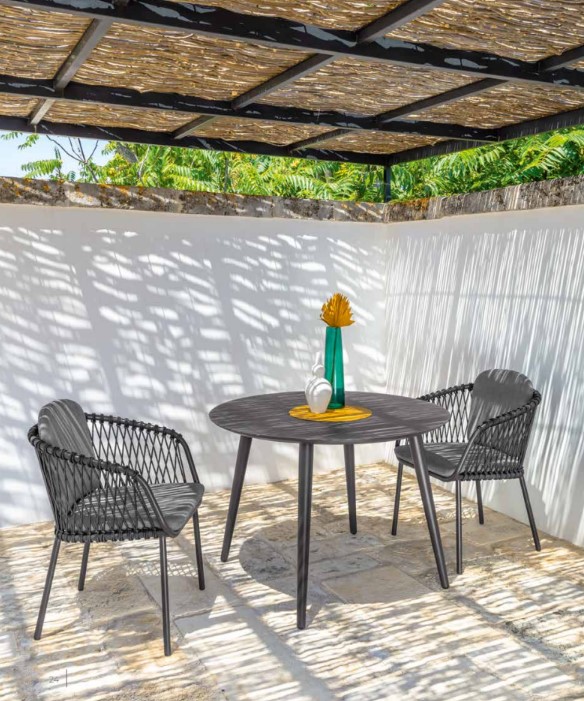 Der Esszimmerstuhl aus der Abel-Kollektion von Talenti besteht aus Aluminium, gewebten Fasern und Stoffkissen.