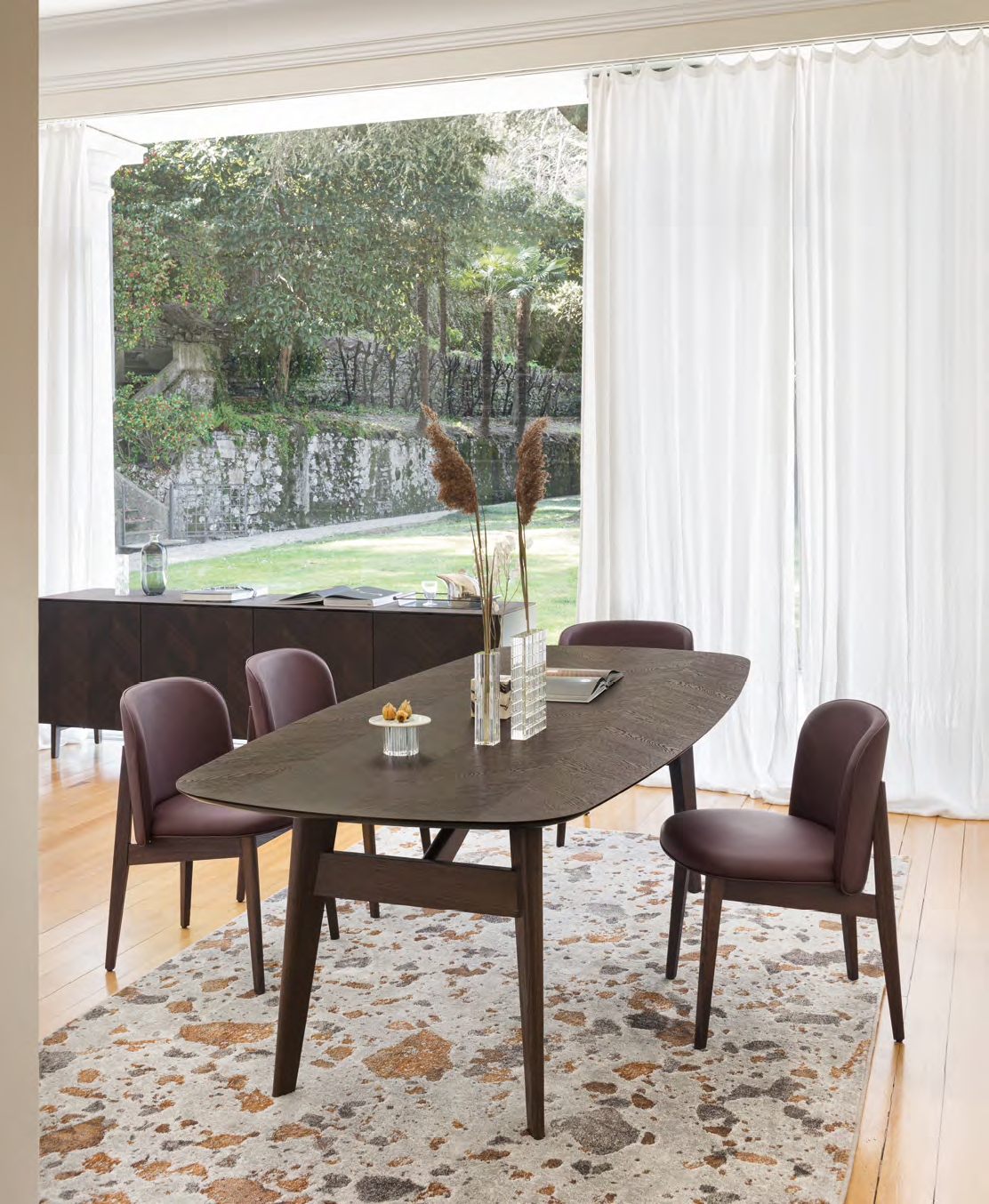 ABREY ist ein eleganter und solider Tisch mit einem Untergestell aus massiver Esche mit abgerundetem Querschnitt. Die schlichte Struktur verleiht dem Tisch extreme Eleganz und unterstreicht die Einzigartigkeit der Tischplatten, die sich in Größe, Form und Material unterscheiden.