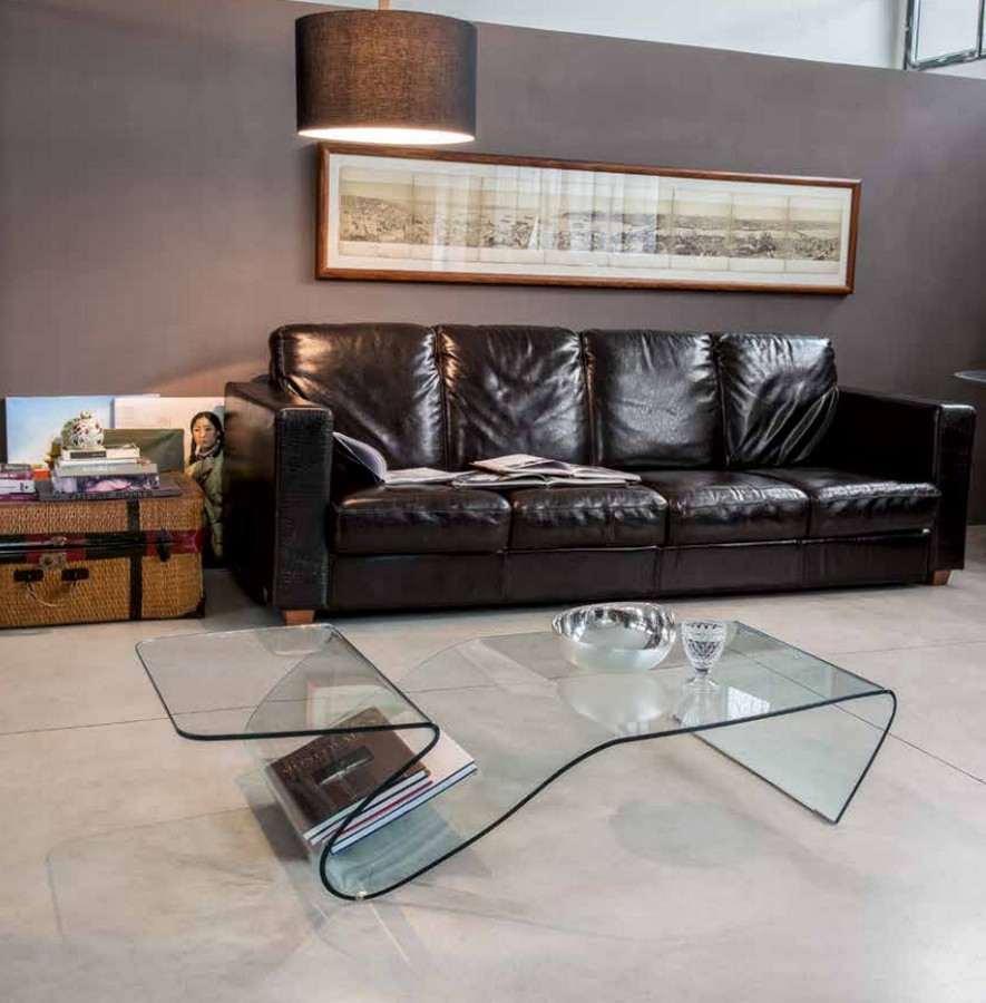 Alaric Couchtisch von Tonin Casa und aus gebogenem Glas mit Doppelregal und Zeitungsständer. Alaric ist eine weiche und essentielle Linie. das macht die besondere Verarbeitung von gebogenem Glas Protagonist. Die Kurven und Aussparungen von Alaric dienen nicht nur als t, sondern auch als Doppelregale und Zeitungsständer