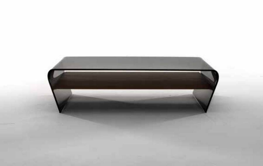 Amaranto Couchtisch von Tonin Casa rechteckig aus gebogenem Glas mit Platte aus gehärtetem Glas oder Holz. Ein Couchtisch, der die Leichtigkeit von gebogenem Glas mit einem Regal aus gehärtetem Glas oder Holz kombiniert. Zwei verschiedene Stile und zwei sofort erkennbare Materialien, die den Wohnbereich perfekt und elegant machen.