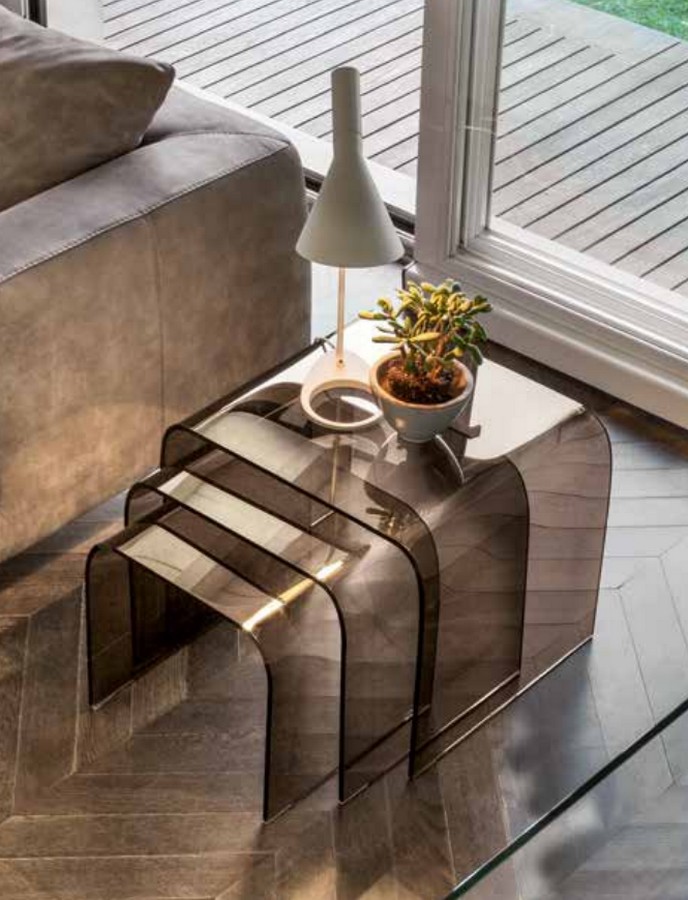 Der Anemonen-Couchtisch von Tonin Casa besteht aus gebogenem Glas mit Glas- oder Holzregal. Anemone ist ein Couchtisch, mit dem Sie einen Blick auf seine Formen werfen können, der jedoch einen Bereich für Ihre wertvollsten Gegenstände verbirgt und schützt. Eine gebogene Holzstruktur bedeckt das Holz- oder Glasregal und unterbricht eine durchgehende Linie, um Rhythmus und Komplexität zu erzeugen. Die verfügbaren Versionen, wie einzelne Tabellen und Diener. oder als Trio von Tischen. Erlaube der Anemone, sich an den unterschiedlichsten Orten zu platzieren.