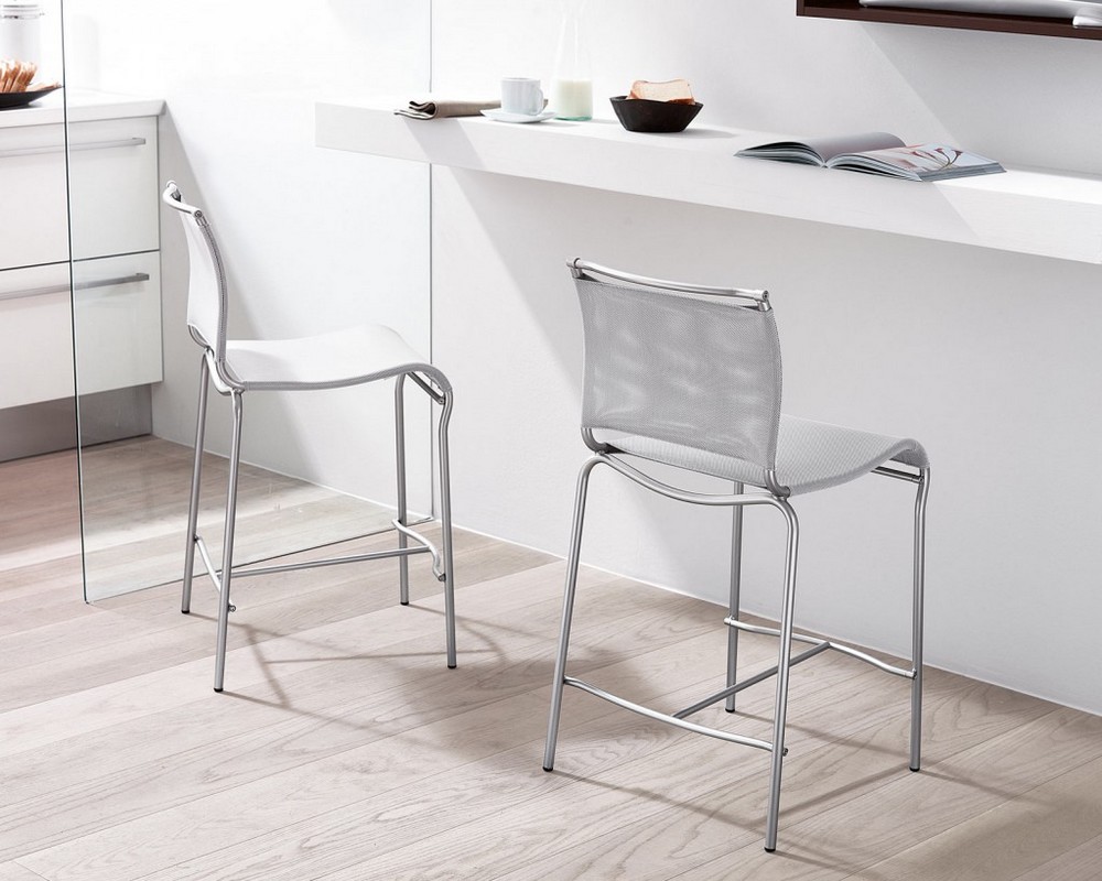 Air CB57 Hocker von Connubia. Metallrahmen mit Fußstütze. Sitz und Rückenlehne mit atmungsaktivem und waschbarem Stoff bezogen. Durch die Verwendung modernster Materialien wie Stahlrohr und synthetischem PVC-Netz (Polyester NET) konnte ein widerstandsfähiger, leichter und handlicher Hocker geschaffen werden. Die sorgfältige Linienführung macht ihn zudem bequem und ergonomisch, der Sitz bietet tatsächlich eine optimale Haltung im täglichen Gebrauch. Der Air-Hocker eignet sich ideal für die Küche oder eine Lounge-Bar.