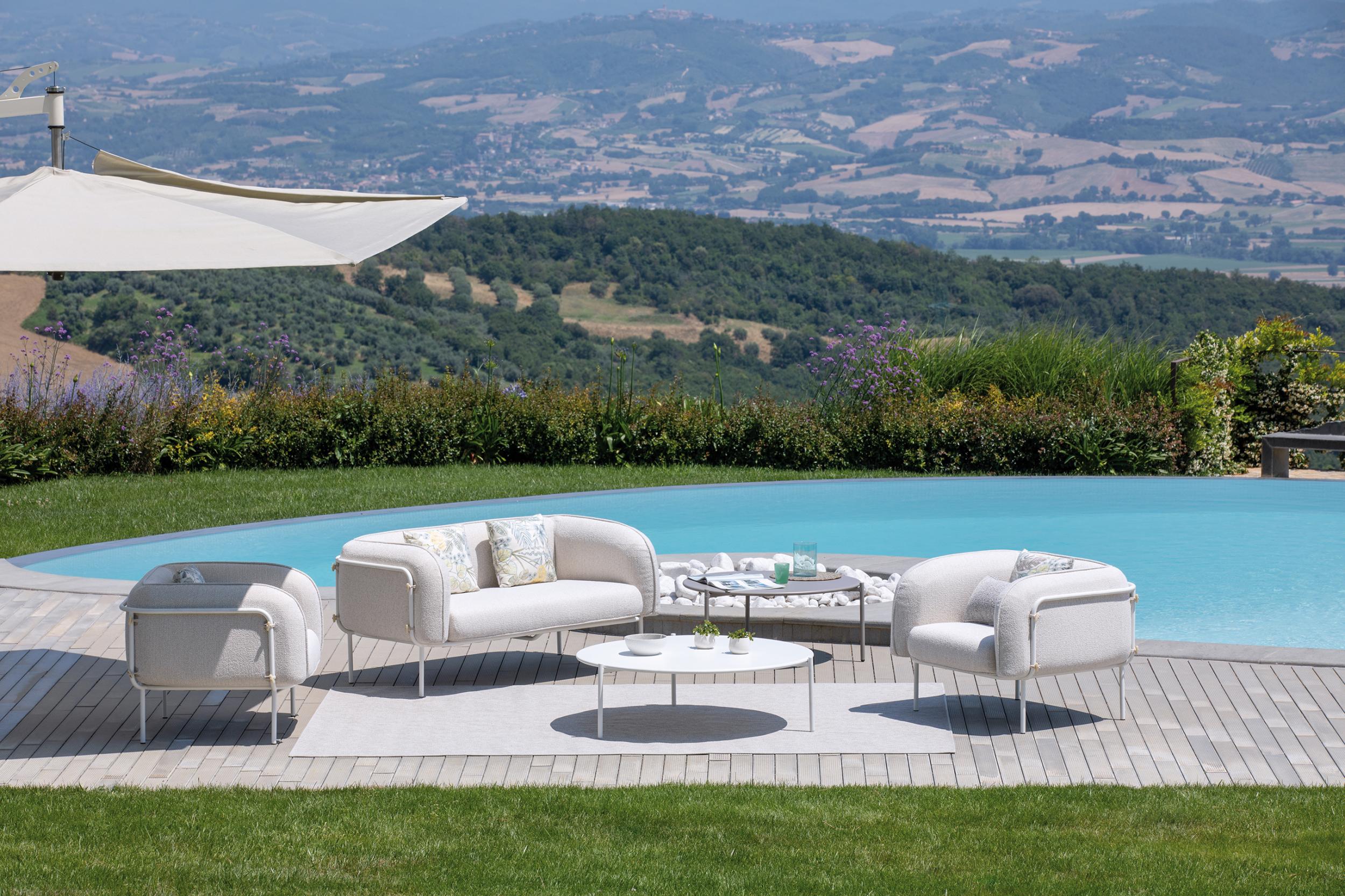 Alamari von Vermobil, verzinkt, wertet Außenbereiche mit einer minimalen Auswahl an Möbeln auf und kann bequem mit oder ohne Kissen verwendet werden. Klare und einfache Linien betonen die Schönheit der Umgebung in einer Kollektion, bei der der Stil das Wesentliche ist.