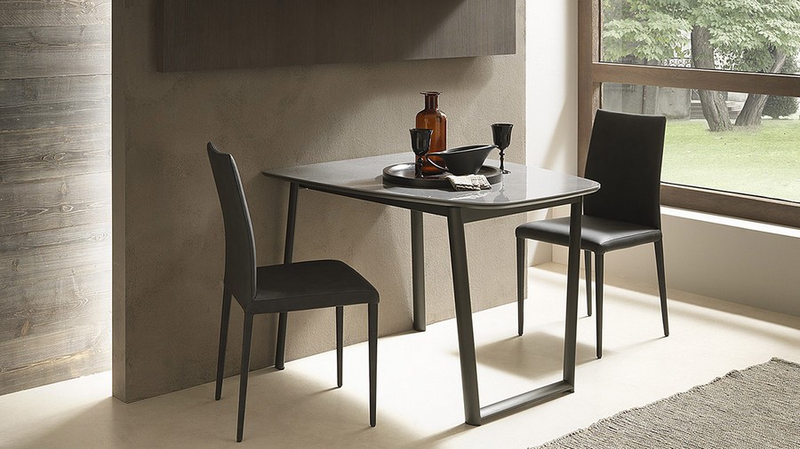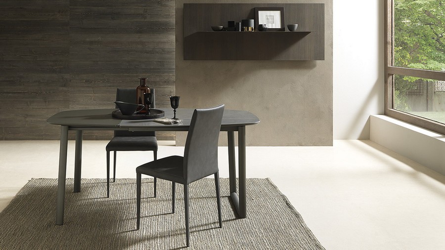 Ribot Ausziehtisch von Altacom. Esstisch mit ausziehbarem Metallgestell, Teleskopmechanismus, Tischplatte aus Melamin, lackiert, Holz, Mörteloptik oder Keramik und klappbarer Innenverlängerung. Tischplatte aus Melamin, lackiert, Holz oder Mörteloptik: Verlängerung in der gleichen Ausführung wie die Tischplatte. Keramikplatte: Verlängerung in der gleichen Farbe wie die Platte.