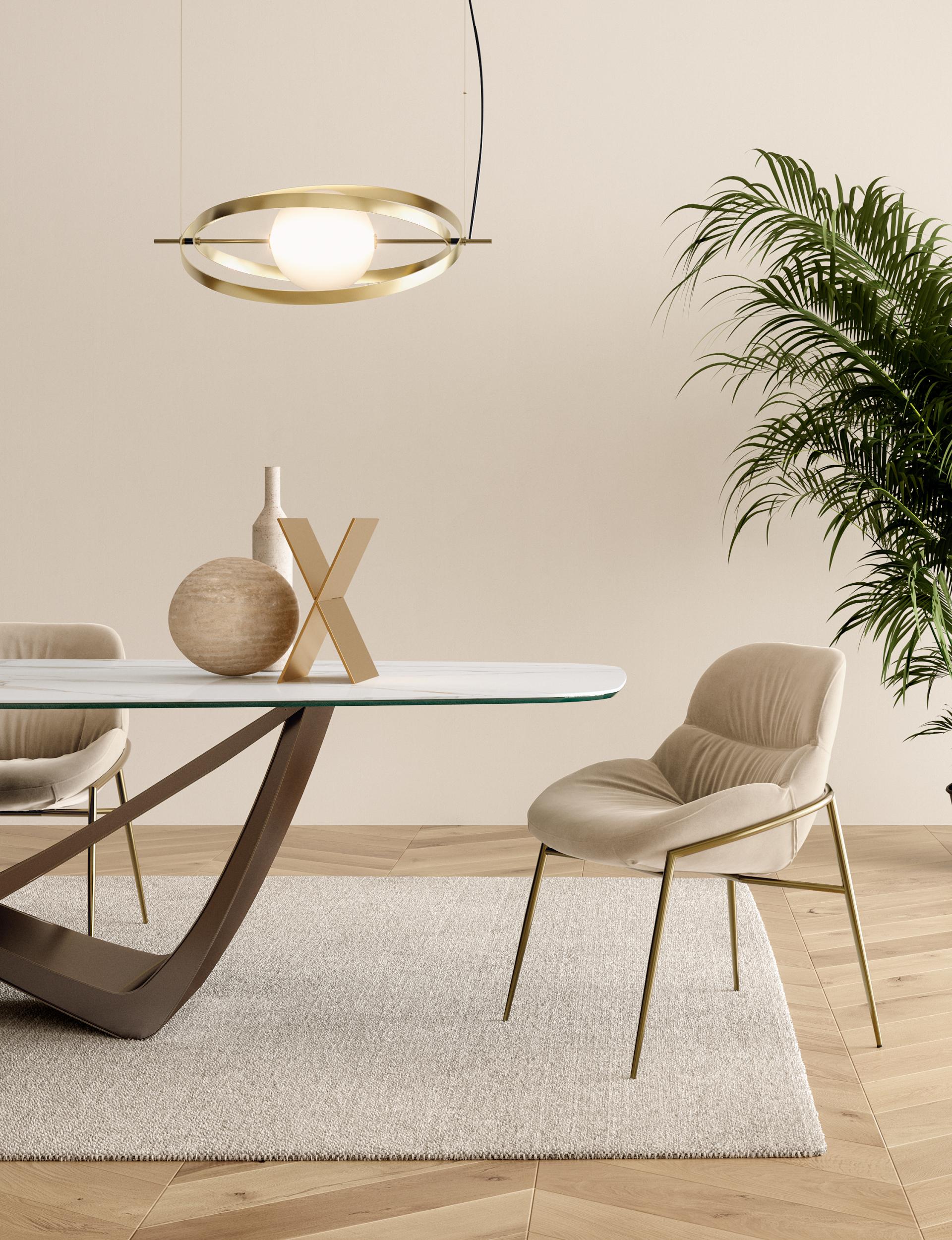 Stuhl mit Gestell aus Massivholz oder lackiertem Stahl. Gepolsterte und gepolsterte Schale in zahlreichen Ausführungen und Farben.