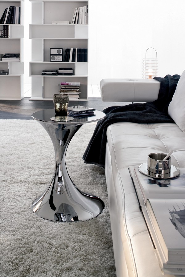 Andorra Couchtisch von Tonin Casa mit lackiertem oder verchromtem Metallfuß, Glasplatte, Holz- oder Feinsteinzeug in verschiedenen Ausführungen. Andorra praktisch und Design trifft jeden Geschmack. Eine weiche und stromlinienförmige Verarbeitung für die Andorra-Basis: Ein Kreis, der zur Mitte hin abfällt und sich nach oben öffnet, was ebenfalls rund ist. Eine Vorstellung von Leichtigkeit und Flexibilität, die in jeder Umgebung genutzt werden kann.