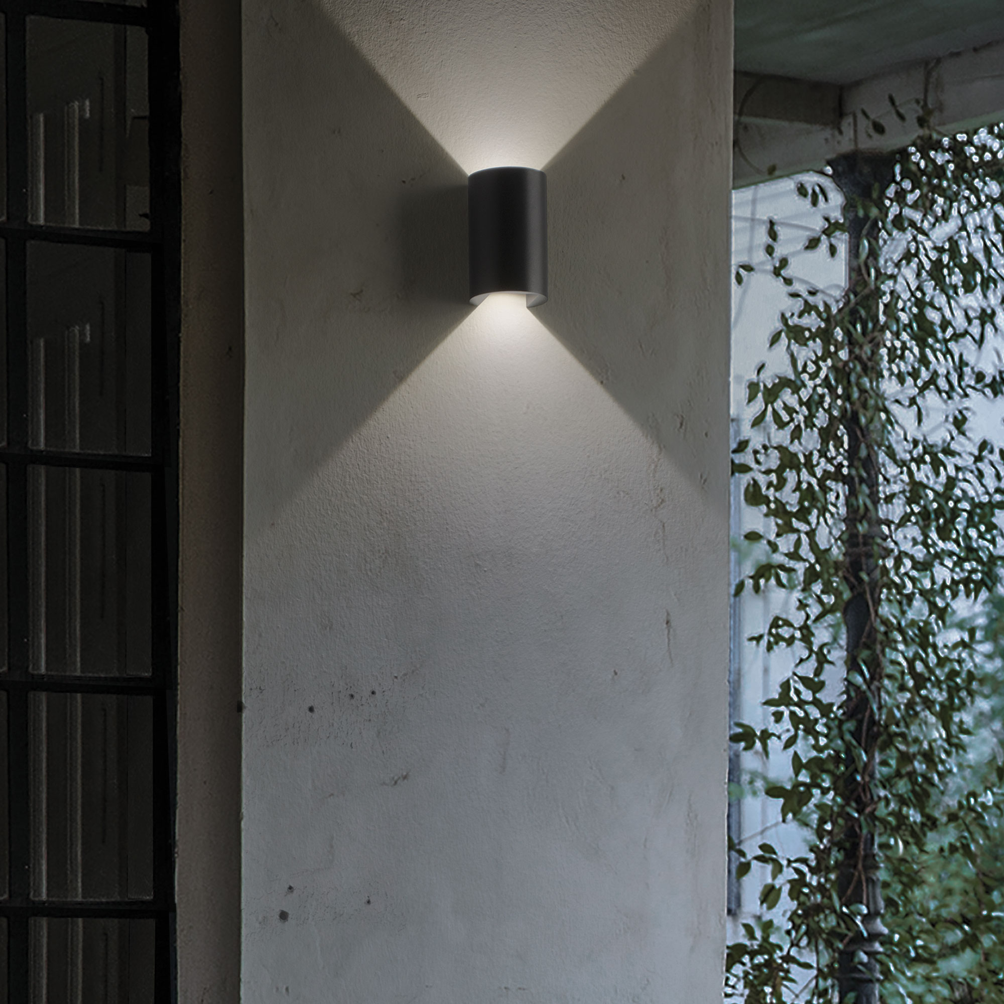 Apollo-Außenwandleuchte mit Leuchtenkörper aus Aluminiumdruckguss mit mattschwarzer Pulverlackierung. Lichtaustritt oben und unten. 4000 K LED-Lichtquelle, 30.000 h Lebensdauer.