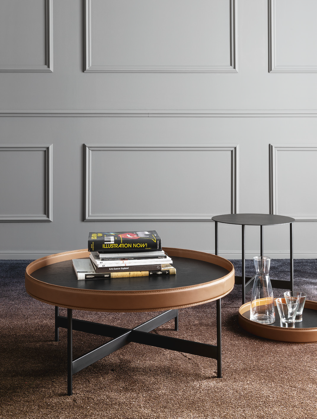 Der Couchtisch ARENA CS5118 von Calligaris besteht aus Metallrohr mit einer runden Holzplatte und erhöhten Kanten, die mit regeneriertem Leder bezogen sind. Eine neue Familie von Couchtischen, bei denen Schlichtheit und Eleganz harmonisch miteinander verschmelzen.