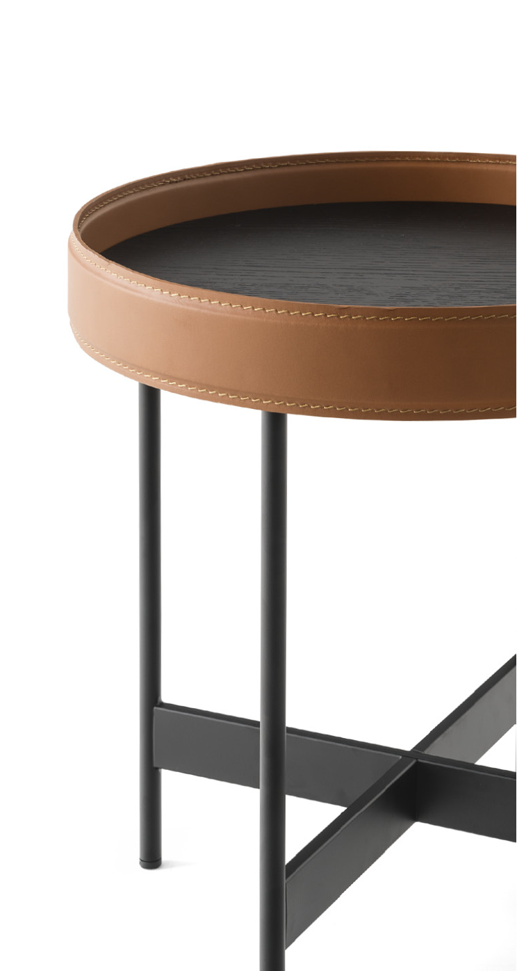 Arena ist eine Kollektion von Couchtischen, bei denen Ästhetik und Funktionalität perfekt harmonieren. Der schlanke, lackierte Metallrahmen des Tisches beherbergt ein Tablett aus Holz und recyceltem Leder und verwandelt sich bei geselligen Anlässen in ein elegantes Servieraccessoire.