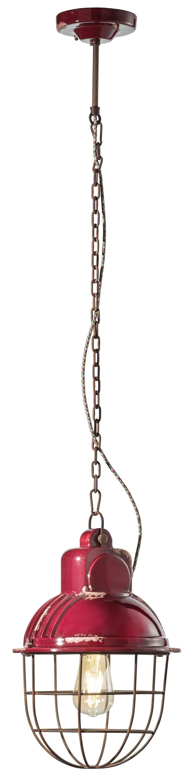 Keramiklampe mit Metallteilen und antiker Corteneisenkette und mehrfarbigem, ummanteltem Baumwollkabel.