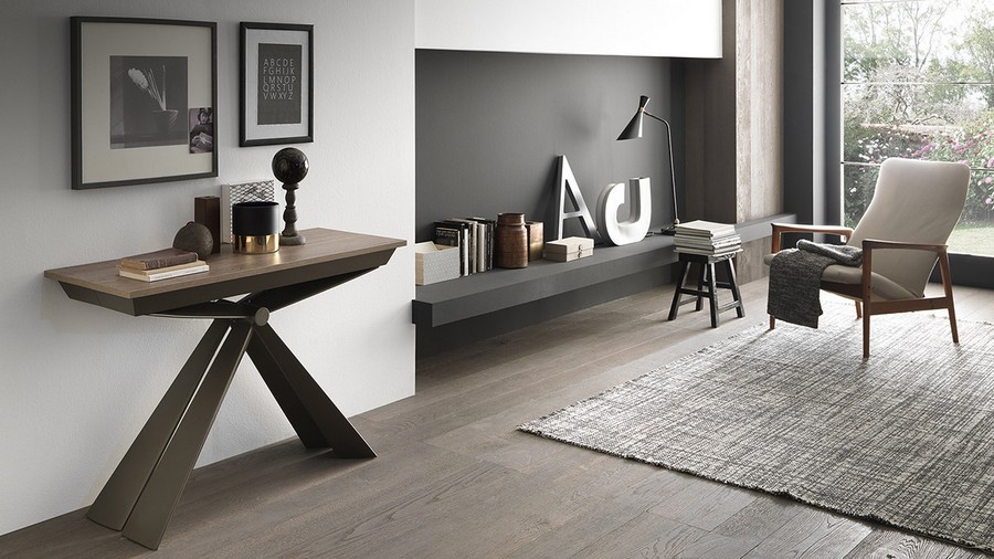 Ausziehbare Konsole Genesi von Altacom, Metallrahmen, Teleskopmechanismus aus Aluminium, Platte aus Melamin, Holz, Mörteleffekt oder Keramik, 3 Verlängerungen. Zentrale Stützbeine in der gleichen Farbe wie der Rahmen.