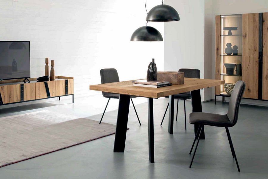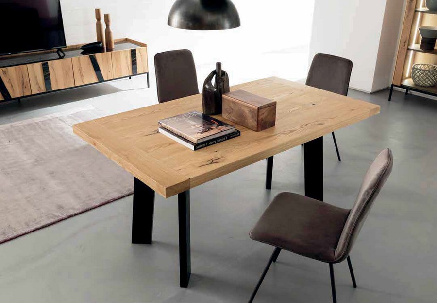 Street ausziehbarer Tisch von Altacorte mit schwarzen Metallbeinen. 5 cm dicke gebürstete Platte, erhältlich in verschiedenen Ausführungen. Das Schnellöffnungssystem ermöglicht die Erweiterung des Tisches um 2 Stufen und die Eindämmung der Verlängerungen.