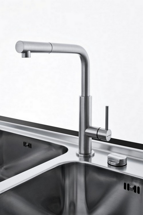 Federmischer 1RUBMOF1Cdi Barazza aus verchromtem Edelstahl. Abnehmbare Duscharmatur mit 360 ° Drehmöglichkeit. Interne Patrone mit Keramikscheiben. Schöner funktioneller Wasserhahn für Ihr Spülbecken.