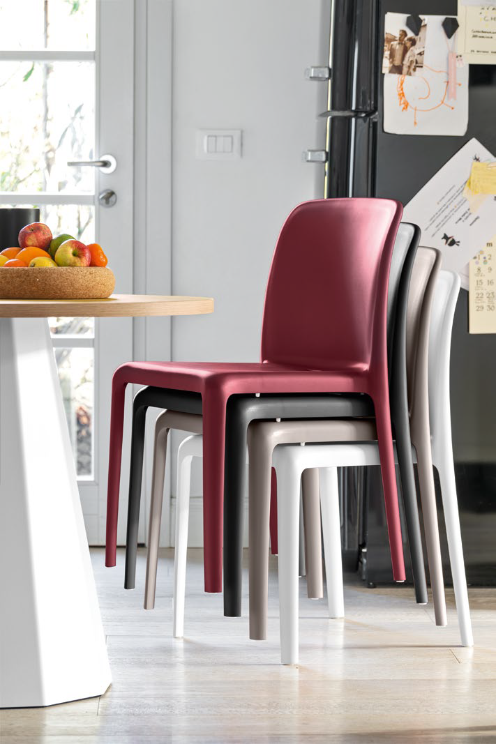 Bayo CB1983 Stuhl von Connubia. Polypropylen-Monocoque, hergestellt mit Air-Moulding-Technologie, das gleichzeitig Leichtigkeit und Festigkeit bewahrt. Der Kontrast zwischen ausdrucksstarkem Design und abgerundeten Ecken betont die leicht konisch zulaufende Rückenlehne. Geeignet sowohl für den privaten als auch für den Objektbereich. Der Bayo-Stuhl ist auch für den Außenbereich perfekt geeignet und lässt sich sechsfach stapeln. Austauschbare Füße.