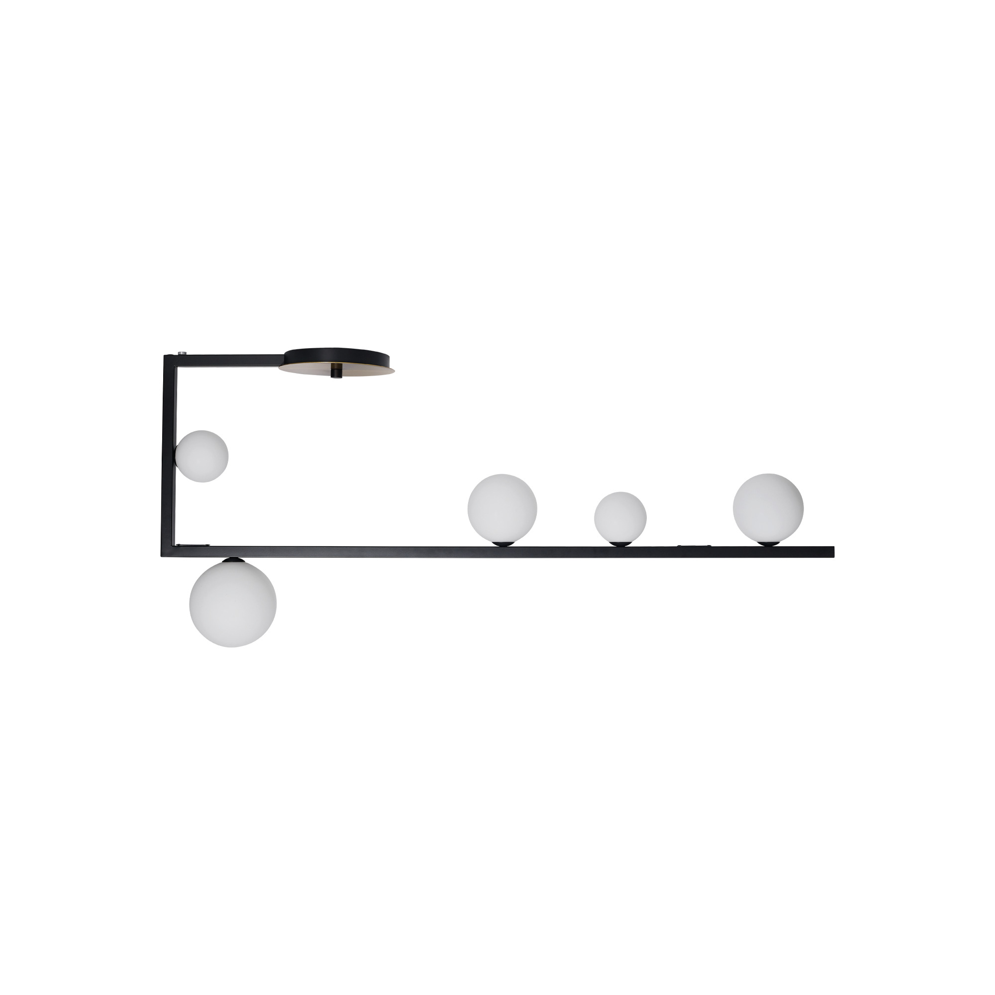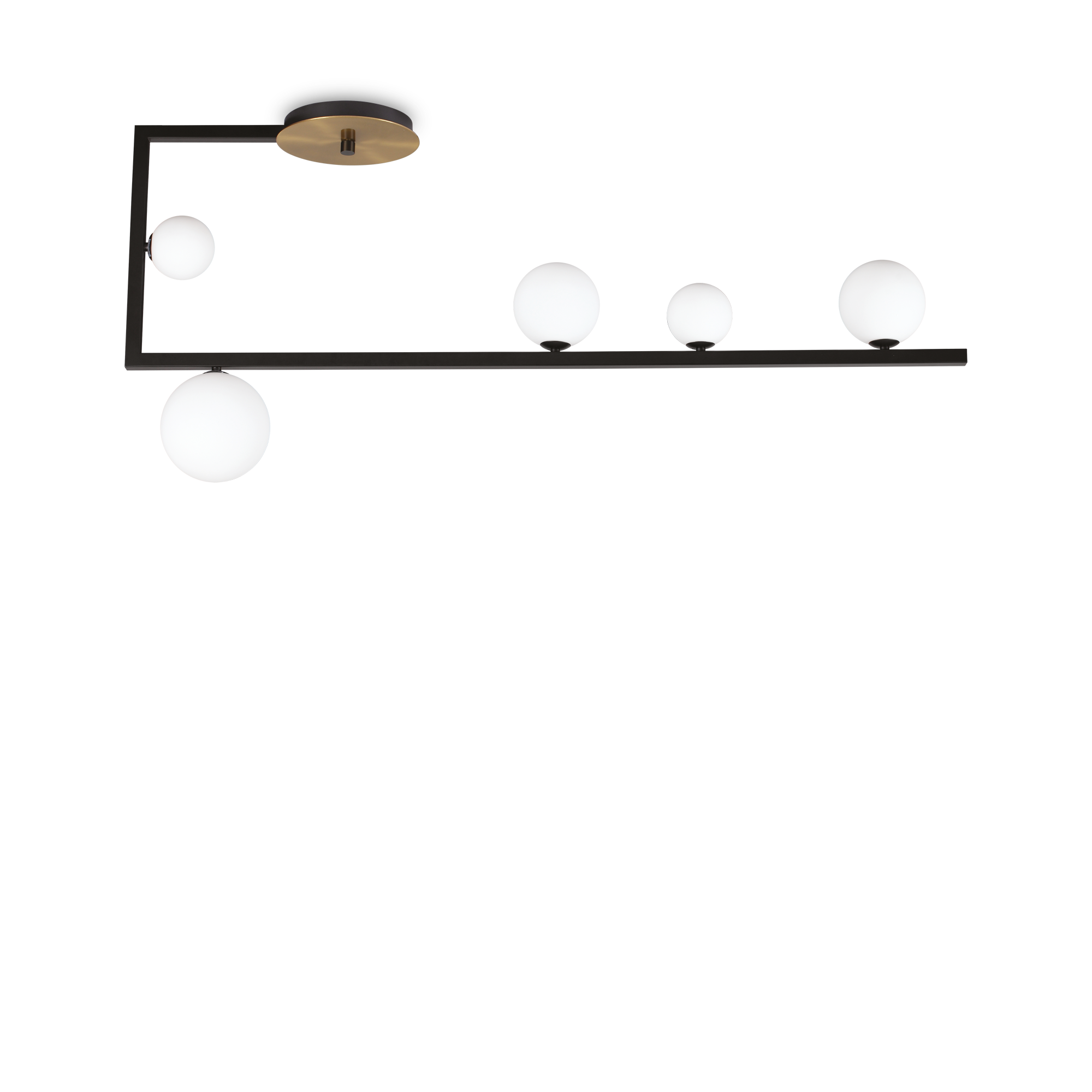 BIRDS PL5 Deckenleuchte von Ideal Lux mit lackiertem Metallrahmen und dekorativer satinierter Messingscheibe. Diffusoren aus geätztem weißem geblasenem Glas. Farbe: Mattschwarz mit satinierten Messingdetails. Glühbirnen im Lieferumfang enthalten.