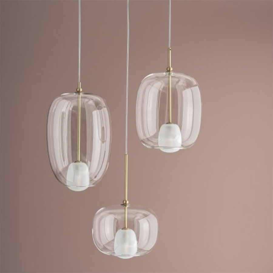 Hängeleuchte mit Rosette und Struktur aus Naturmessing und Borosilikatglas und auf Anfrage Hängeleuchte für Cluster-Kompositionen von zwei bis sechs Aufhängungen mit Struktur und Dezentralisierung aus Naturmessing und Borosilikatglas.