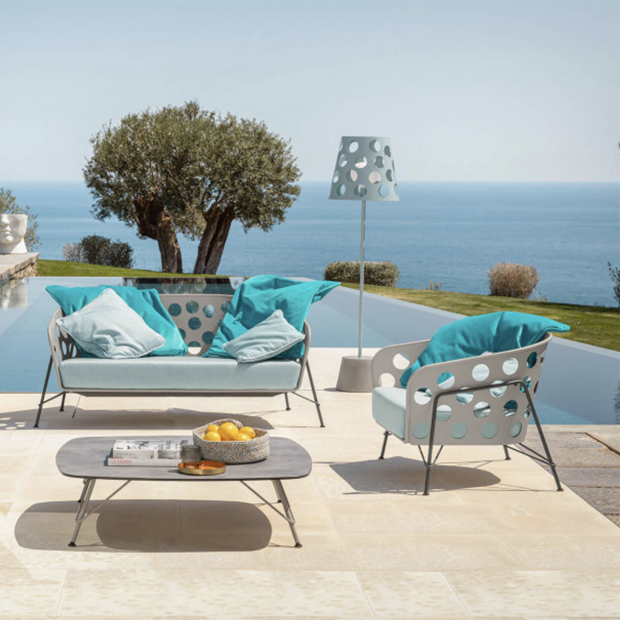 Die neue Bolle-Kollektion wurde für den Außenbereich entworfen und umfasst Sofas, Sessel und Leuchten aus makroperforiertem, farbigem Metall mit einer weichen und verspielt-bezaubernden Ästhetik. Der Name Bolle leitet sich von der speziellen Verarbeitung der Metallschalen ab, die ein Muster mit starker grafischer Wirkung erzeugt.